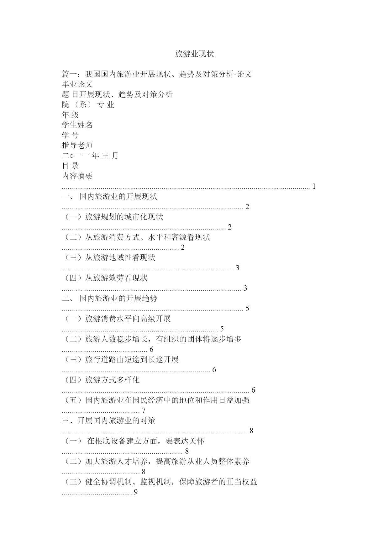 旅游业现状篇一:我国国内旅游业开展现状、趋势及对策分析-论文毕业论文题目开展现状、趋势及对策分析院(系)专业年级学生姓名学号指导老师二○一一年三月目录内容摘要...............................................................................................................................1一、国内旅游业的开展现状....................................
