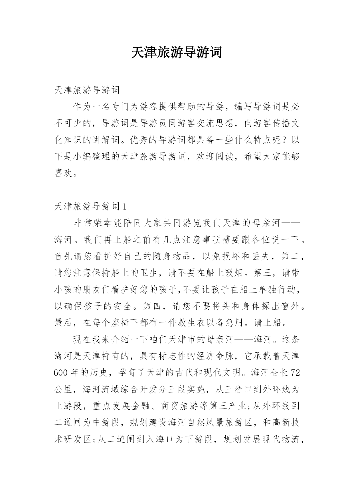 天津旅游导游词天津旅游导游词作为一名专门为游客提供帮助的导游,编写导游词是必不可少的,导游词是导游员同游客交流思想,向游客传播文化知识的讲解词。优秀的导游词都具备一些什么特点呢?以下是小编整理的天津旅游导游词,欢迎阅读,希望大家能够喜欢。天津旅游导游词1非常荣幸能陪同大家共同游览我们天津的母亲河——海河。我们再上船之前有几点注意事项需要跟各位说一下。首先请您看护好自己的随身物品,以免损坏和丢失,第二,请您注意保持船上的卫生,请不要在船上吸烟。第三,请带小孩的朋友们看护好您的孩子,不要让孩子在船上单独行动,