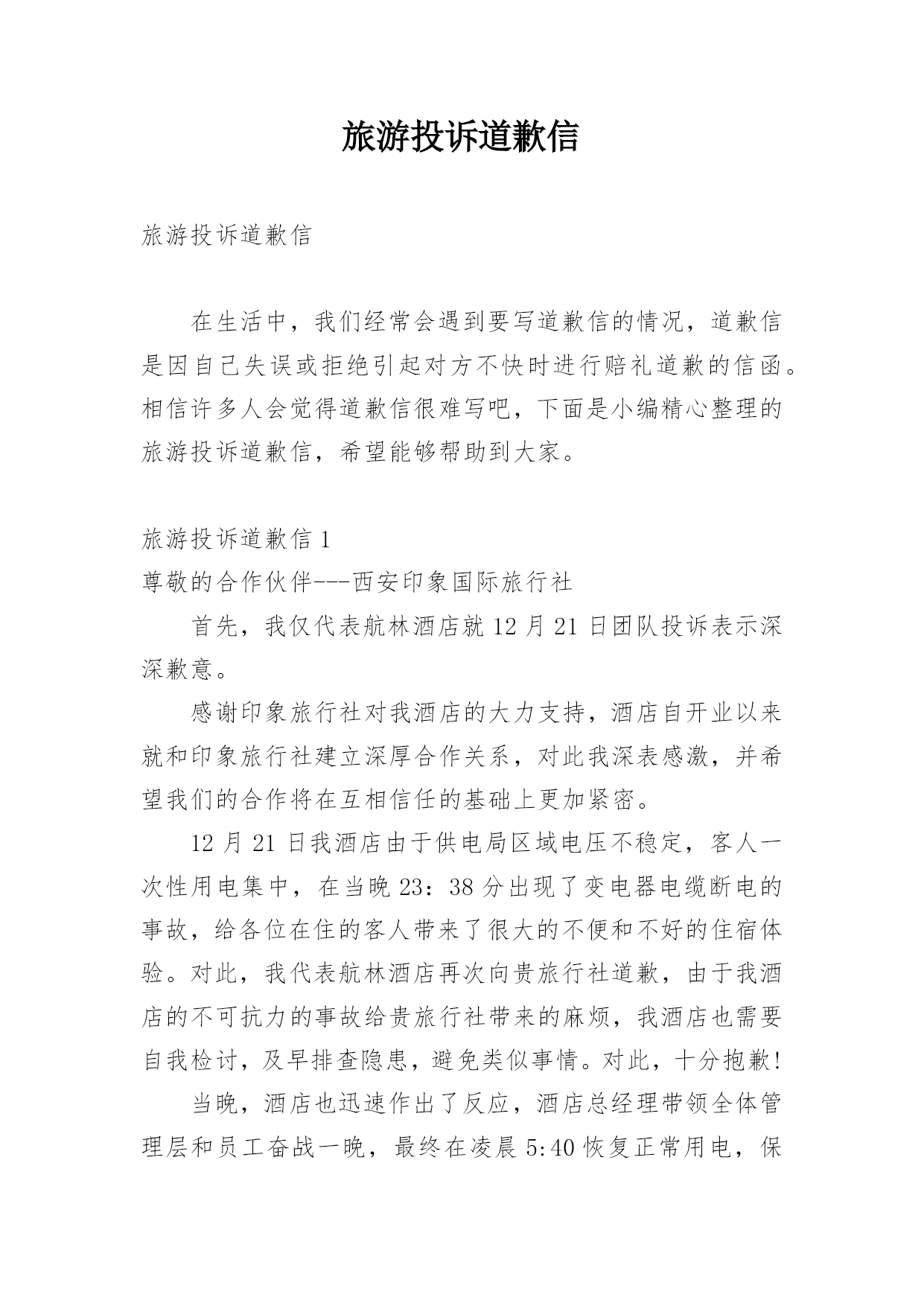 旅游投诉道歉信旅游投诉道歉信在生活中,我们经常会遇到要写道歉信的情况,道歉信是因自己失误或拒绝引起对方不快时进行赔礼道歉的信函。相信许多人会觉得道歉信很难写吧,下面是小编精心整理的旅游投诉道歉信,希望能够帮助到大家。旅游投诉道歉信1尊敬的合作伙伴---西安印象国际旅行社首先,我仅代表航林酒店就12月21日团队投诉表示深深歉意。感谢印象旅行社对我酒店的大力支持,酒店自开业以来就和印象旅行社建立深厚合作关系,对此我深表感激,并希望我们的合作将在互相信任的基础上更加紧密。12月21日我酒店由于供电局区域电压不稳