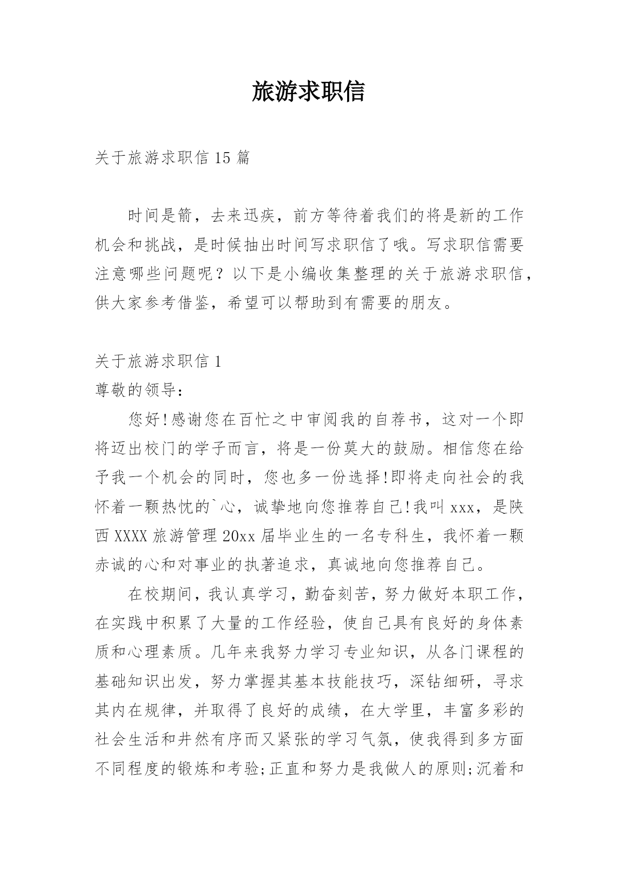 旅游求职信关于旅游求职信15篇时间是箭,去来迅疾,前方等待着我们的将是新的工作机会和挑战,是时候抽出时间写求职信了哦。写求职信需要注意哪些问题呢?以下是小编收集整理的关于旅游求职信,供大家参考借鉴,希望可以帮助到有需要的朋友。关于旅游求职信1尊敬的领导:您好!感谢您在百忙之中审阅我的自荐书,这对一个即将迈出校门的学子而言,将是一份莫大的鼓励。相信您在给予我一个机会的同时,您也多一份选择!即将走向社会的我怀着一颗热忱的`心,诚挚地向您推荐自己!我叫xxx,是陕西XXXX旅游管理20xx届毕业生的一名专科生,