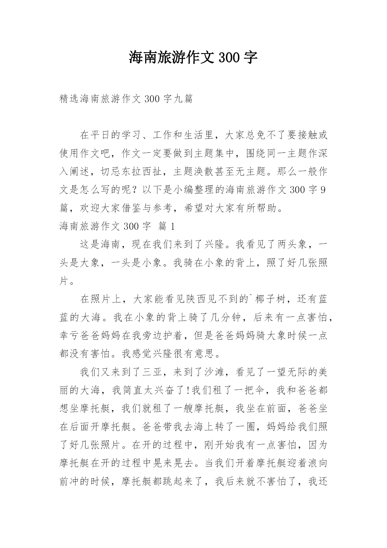 海南旅游作文300字精选海南旅游作文300字九篇在平日的学习、工作和生活里,大家总免不了要接触或使用作文吧,作文一定要做到主题集中,围绕同一主题作深入阐述,切忌东拉西扯,主题涣散甚至无主题。那么一般作文是怎么写的呢?以下是小编整理的海南旅游作文300字9篇,欢迎大家借鉴与参考,希望对大家有所帮助。海南旅游作文300字篇1这是海南,现在我们来到了兴隆。我看见了两头象,一头是大象,一头是小象。我骑在小象的背上,照了好几张照片。在照片上,大家能看见陕西见不到的`椰子树,还有蓝蓝的大海。我在小象的背上骑了几分钟,
