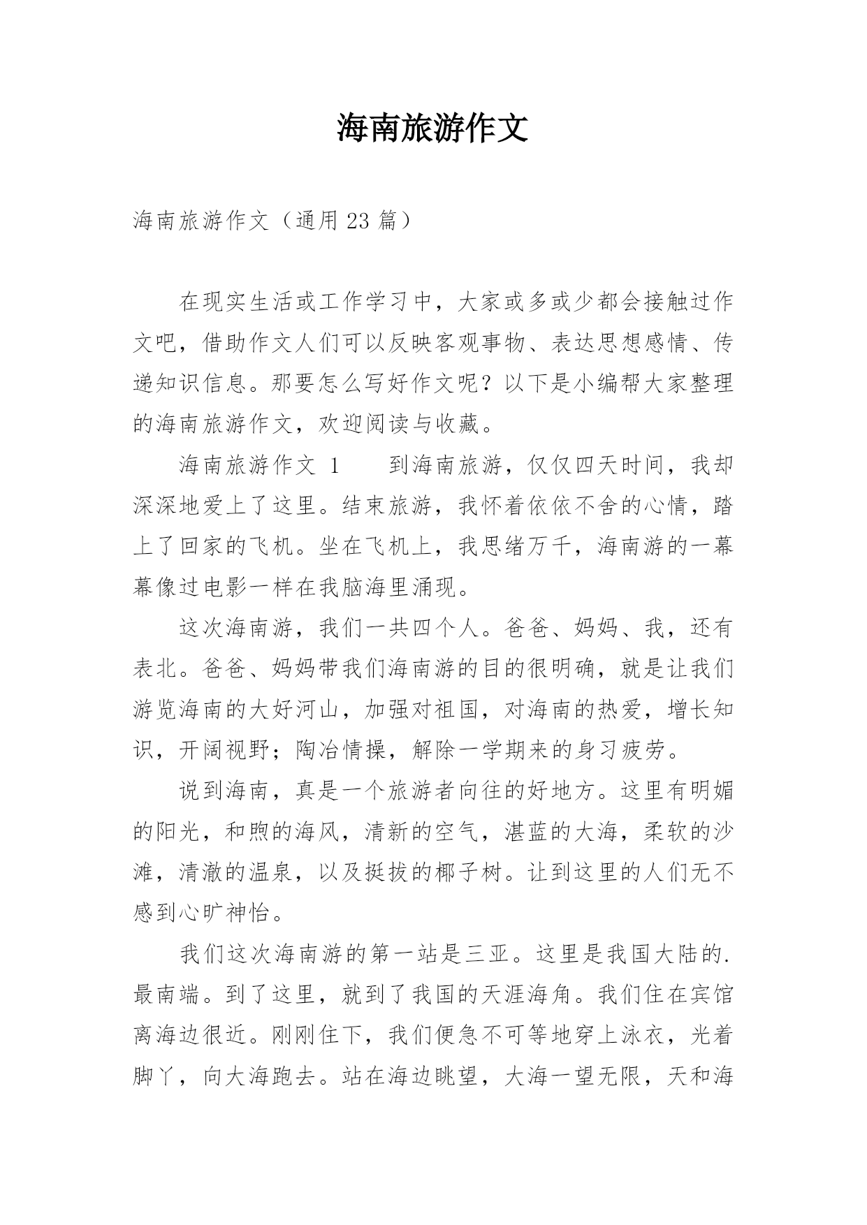 海南旅游作文海南旅游作文(通用23篇)在现实生活或工作学习中,大家或多或少都会接触过作文吧,借助作文人们可以反映客观事物、表达思想感情、传递知识信息。那要怎么写好作文呢?以下是小编帮大家整理的海南旅游作文,欢迎阅读与收藏。海南旅游作文1到海南旅游,仅仅四天时间,我却深深地爱上了这里。结束旅游,我怀着依依不舍的心情,踏上了回家的飞机。坐在飞机上,我思绪万千,海南游的一幕幕像过电影一样在我脑海里涌现。这次海南游,我们一共四个人。爸爸、妈妈、我,还有表北。爸爸、妈妈带我们海南游的目的很明确,就是让我们游览海南的