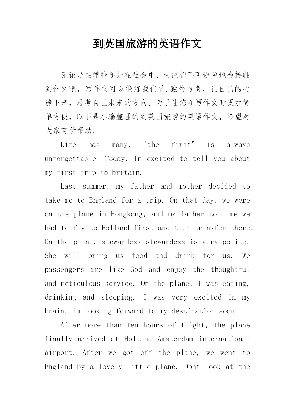到英国旅游的英语作文无论是在学校还是在社会中,大家都不可避免地会接触到作文吧,写作文可以锻炼我们的.独处习惯,让自己的心静下来,思考自己未来的方向。为了让您在写作文时更加简单方便,以下是小编整理的到英国旅游的英语作文,希望对大家有所帮助。Lifehasmany,"thefirst"isalwaysunforgettable.Today,Imexcitedtotellyouaboutmyfirsttriptobritain.Lastsummer,myfatherandmotherdecidedtotakem