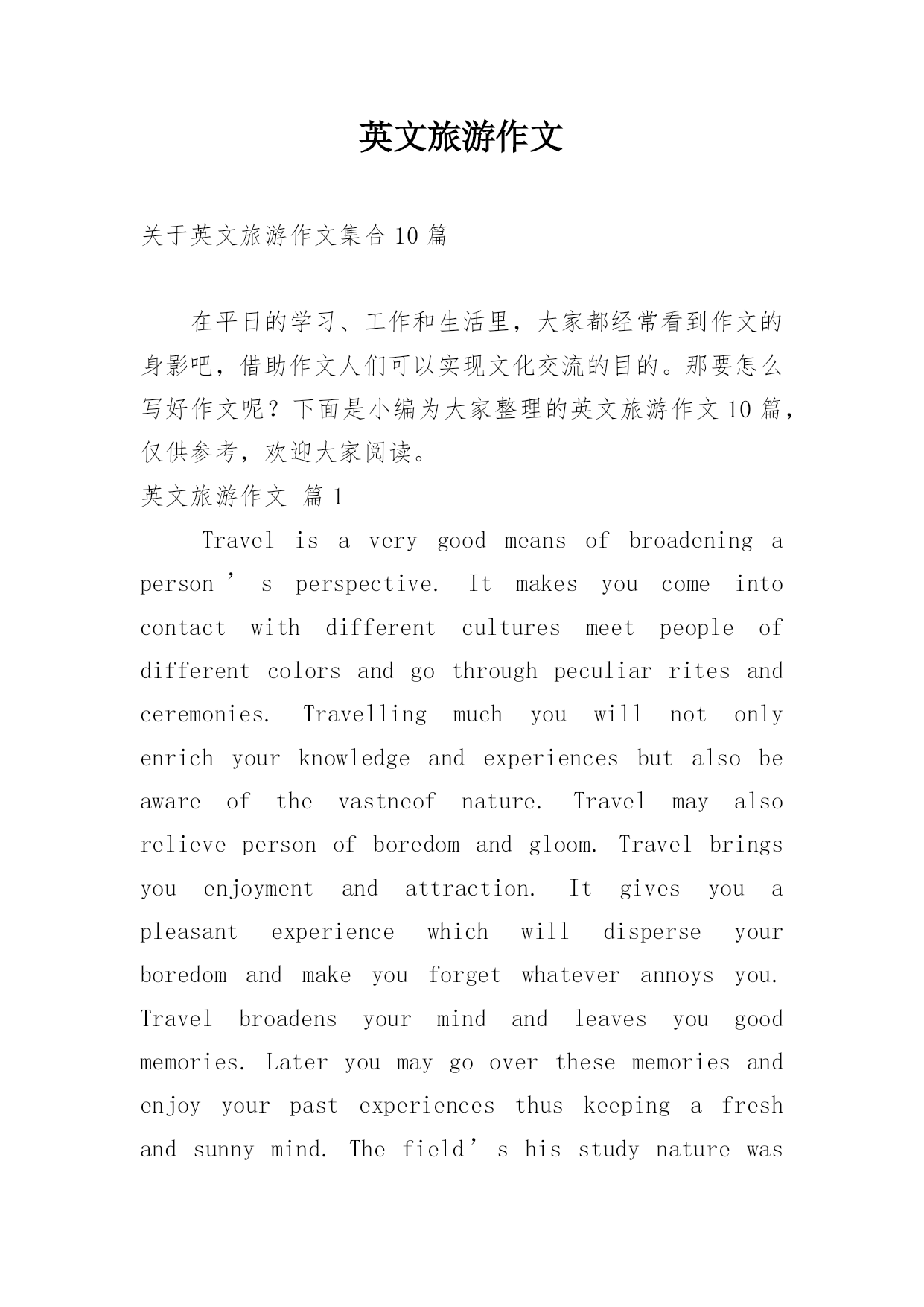 英文旅游作文关于英文旅游作文集合10篇在平日的学习、工作和生活里,大家都经常看到作文的身影吧,借助作文人们可以实现文化交流的目的。那要怎么写好作文呢?下面是小编为大家整理的英文旅游作文10篇,仅供参考,欢迎大家阅读。英文旅游作文篇1Travelisaverygoodmeansofbroadeningaperson’sperspective.Itmakesyoucomeintocontactwithdifferentculturesmeetpeopleofdifferentcolorsandgothroug