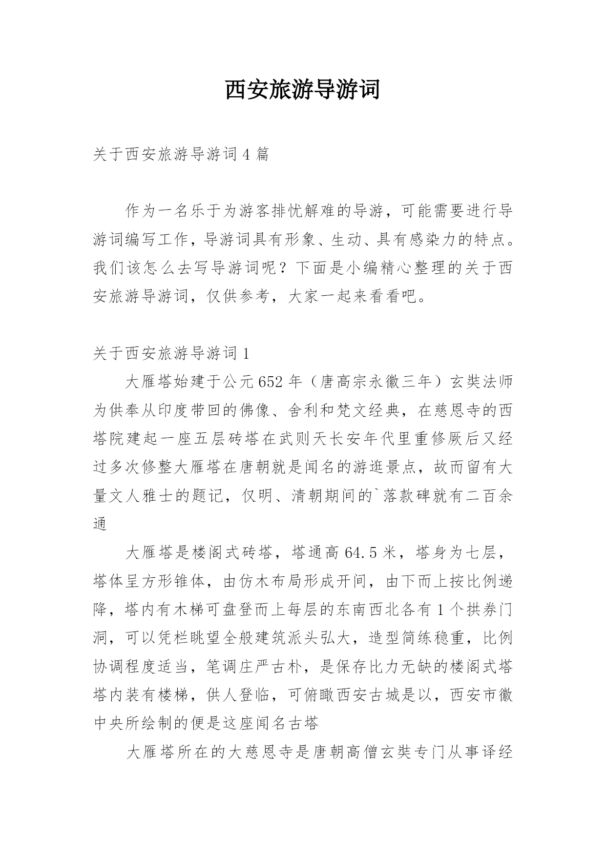 西安旅游导游词关于西安旅游导游词4篇作为一名乐于为游客排忧解难的导游,可能需要进行导游词编写工作,导游词具有形象、生动、具有感染力的特点。我们该怎么去写导游词呢?下面是小编精心整理的关于西安旅游导游词,仅供参考,大家一起来看看吧。关于西安旅游导游词1大雁塔始建于公元652年(唐高宗永徽三年)玄奘法师为供奉从印度带回的佛像、舍利和梵文经典,在慈恩寺的西塔院建起一座五层砖塔在武则天长安年代里重修厥后又经过多次修整大雁塔在唐朝就是闻名的游逛景点,故而留有大量文人雅士的题记,仅明、清朝期间的`落款碑就有二百余通大