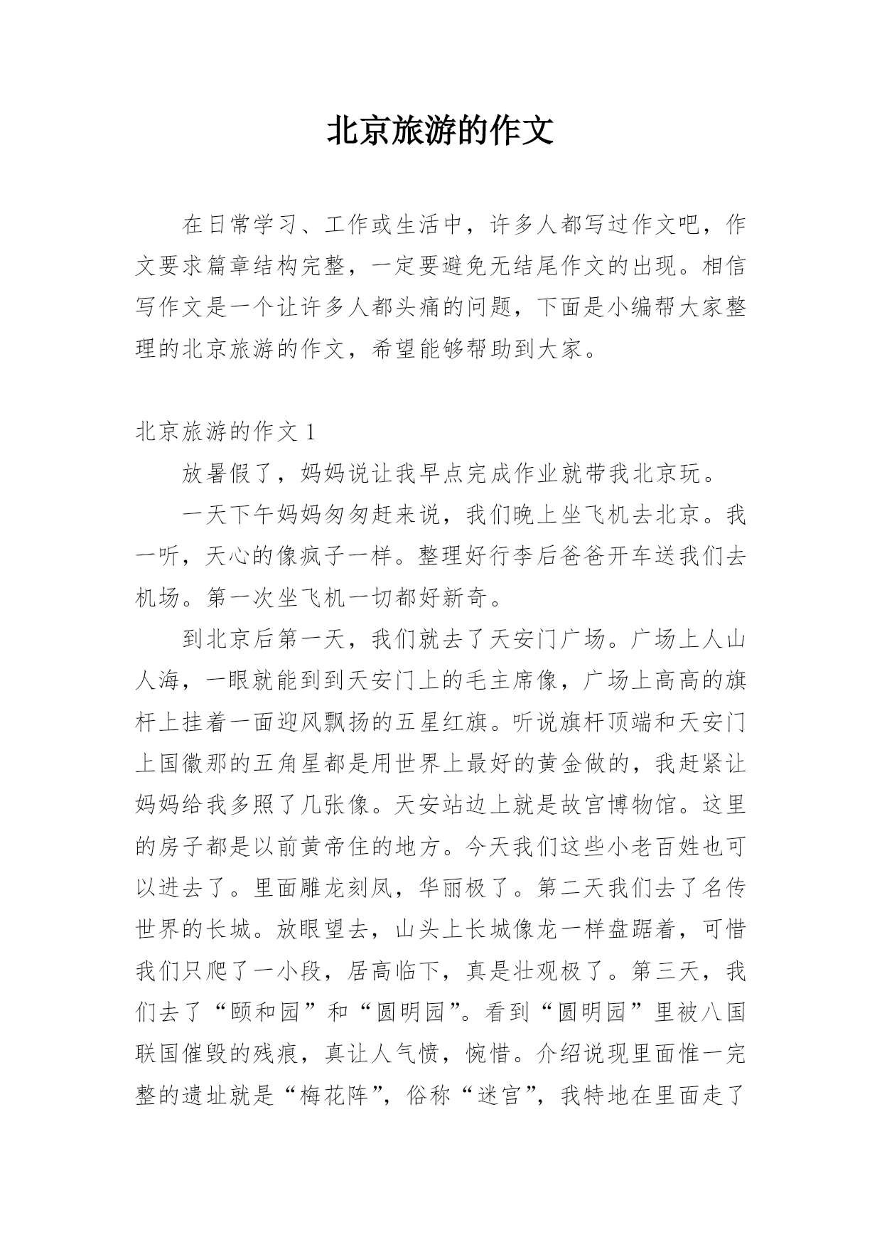 北京旅游的作文在日常学习、工作或生活中,许多人都写过作文吧,作文要求篇章结构完整,一定要避免无结尾作文的出现。相信写作文是一个让许多人都头痛的问题,下面是小编帮大家整理的北京旅游的作文,希望能够帮助到大家。北京旅游的作文1放暑假了,妈妈说让我早点完成作业就带我北京玩。一天下午妈妈匆匆赶来说,我们晚上坐飞机去北京。我一听,天心的像疯子一样。整理好行李后爸爸开车送我们去机场。第一次坐飞机一切都好新奇。到北京后第一天,我们就去了天安门广场。广场上人山人海,一眼就能到到天安门上的毛主席像,广场上高高的旗杆上挂着一