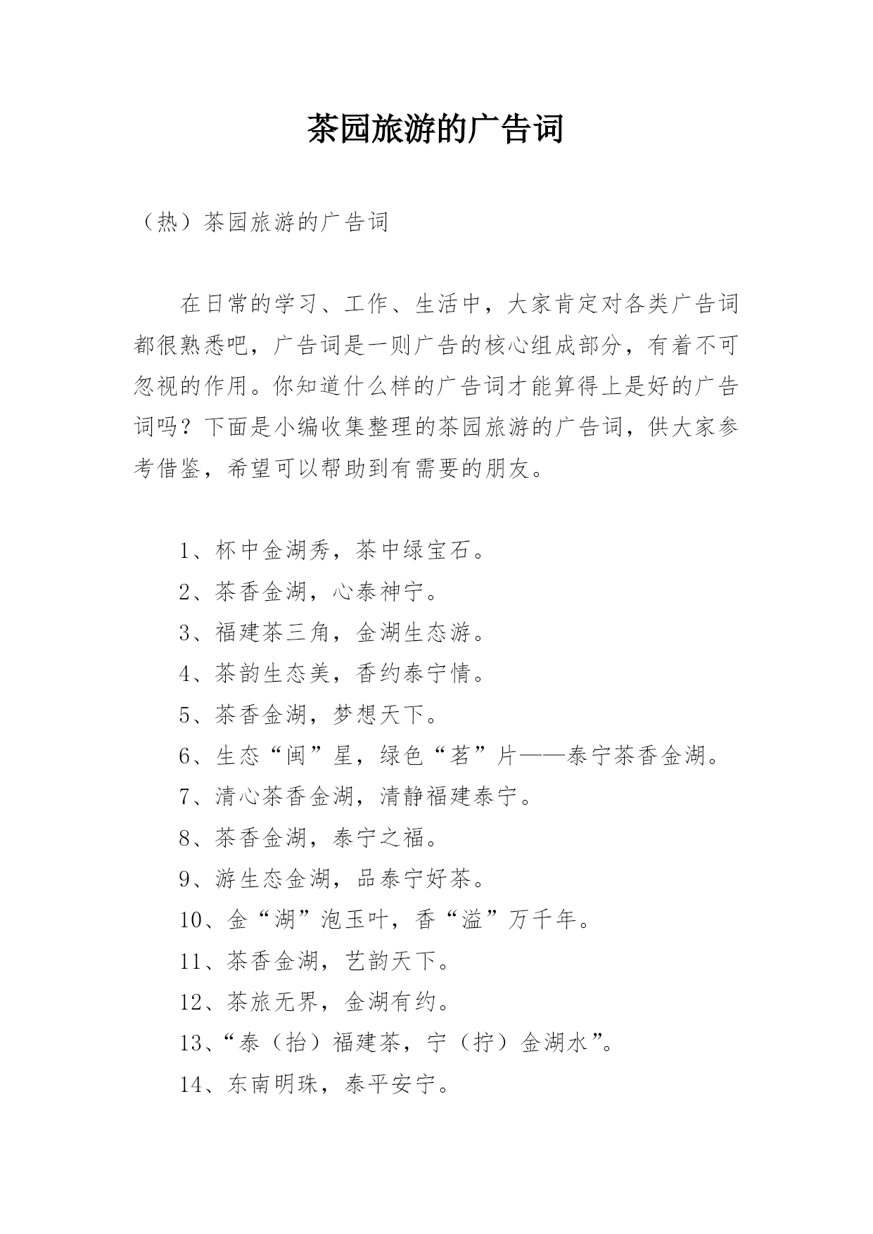 茶园旅游的广告词(热)茶园旅游的广告词在日常的学习、工作、生活中,大家肯定对各类广告词都很熟悉吧,广告词是一则广告的核心组成部分,有着不可忽视的作用。你知道什么样的广告词才能算得上是好的广告词吗?下面是小编收集整理的茶园旅游的广告词,供大家参考借鉴,希望可以帮助到有需要的朋友。1、杯中金湖秀,茶中绿宝石。2、茶香金湖,心泰神宁。3、福建茶三角,金湖生态游。4、茶韵生态美,香约泰宁情。5、茶香金湖,梦想天下。6、生态“闽”星,绿色“茗”片——泰宁茶香金湖。7、清心茶香金湖,清静福建泰宁。8、茶香金湖,泰宁之