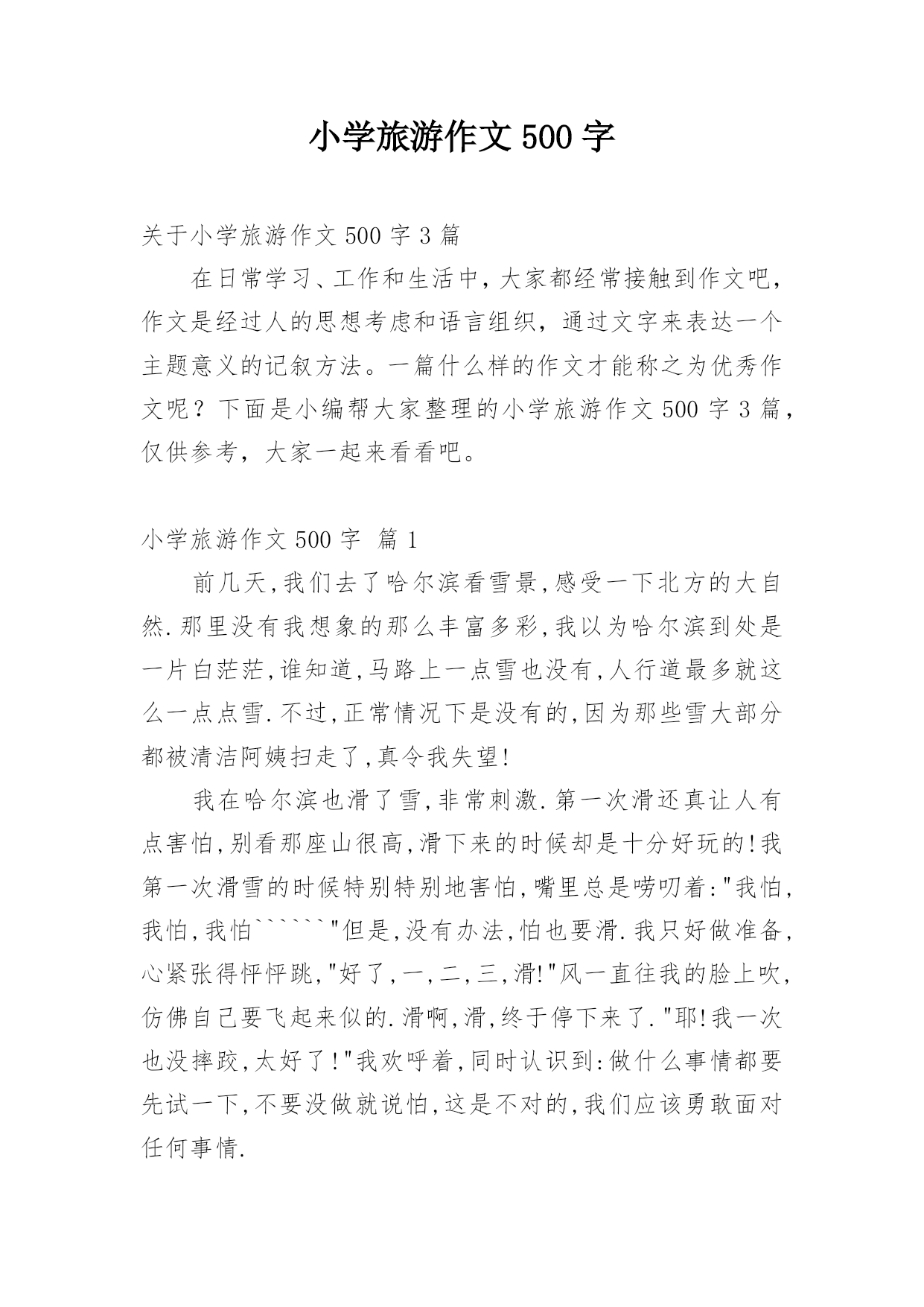 小学旅游作文500字关于小学旅游作文500字3篇在日常学习、工作和生活中,大家都经常接触到作文吧,作文是经过人的思想考虑和语言组织,通过文字来表达一个主题意义的记叙方法。一篇什么样的作文才能称之为优秀作文呢?下面是小编帮大家整理的小学旅游作文500字3篇,仅供参考,大家一起来看看吧。小学旅游作文500字篇1前几天,我们去了哈尔滨看雪景,感受一下北方的大自然.那里没有我想象的那么丰富多彩,我以为哈尔滨到处是一片白茫茫,谁知道,马路上一点雪也没有,人行道最多就这么一点点雪.不过,正常情况下是没有的,因为那些雪