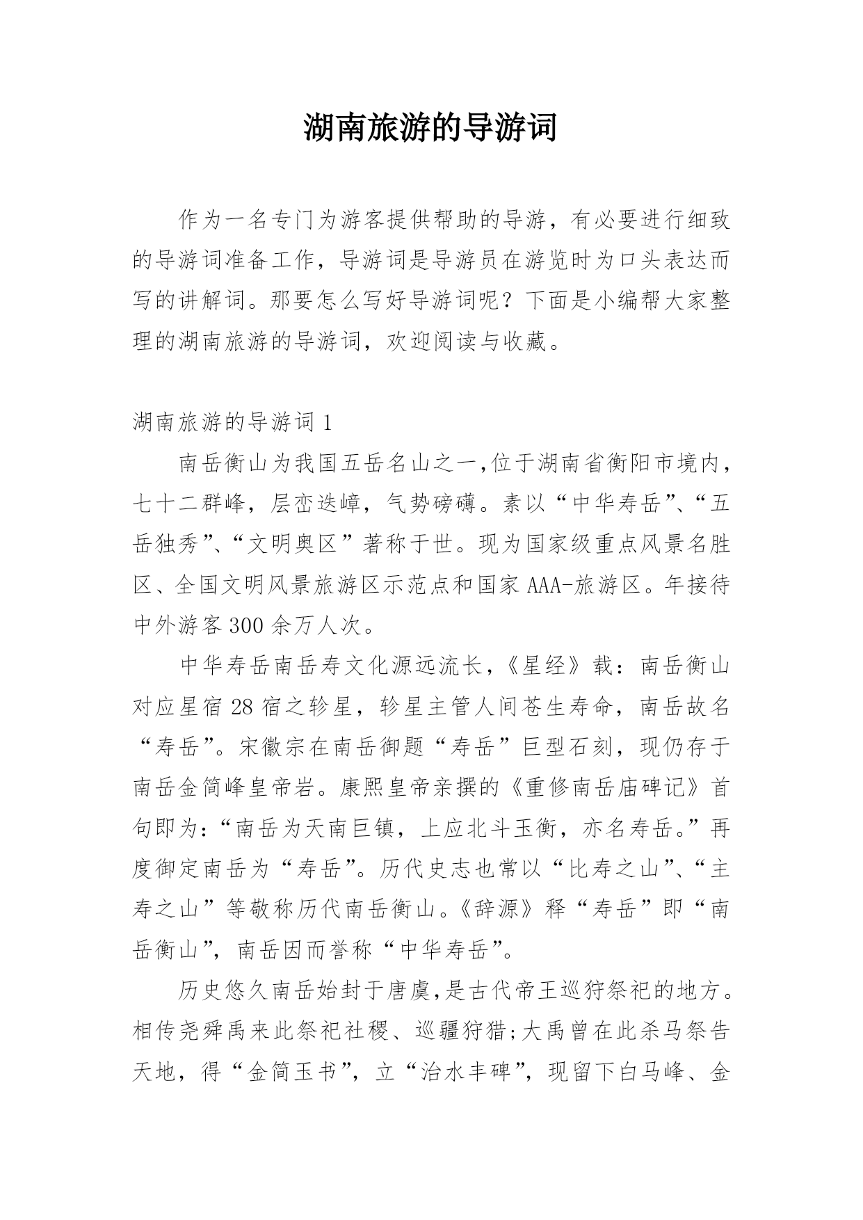 湖南旅游的导游词作为一名专门为游客提供帮助的导游,有必要进行细致的导游词准备工作,导游词是导游员在游览时为口头表达而写的讲解词。那要怎么写好导游词呢?下面是小编帮大家整理的湖南旅游的导游词,欢迎阅读与收藏。湖南旅游的导游词1南岳衡山为我国五岳名山之一,位于湖南省衡阳市境内,七十二群峰,层峦迭嶂,气势磅礴。素以“中华寿岳”、“五岳独秀”、“文明奥区”著称于世。现为国家级重点风景名胜区、全国文明风景旅游区示范点和国家AAA-旅游区。年接待中外游客300余万人次。中华寿岳南岳寿文化源远流长,《星经》载:南岳衡山