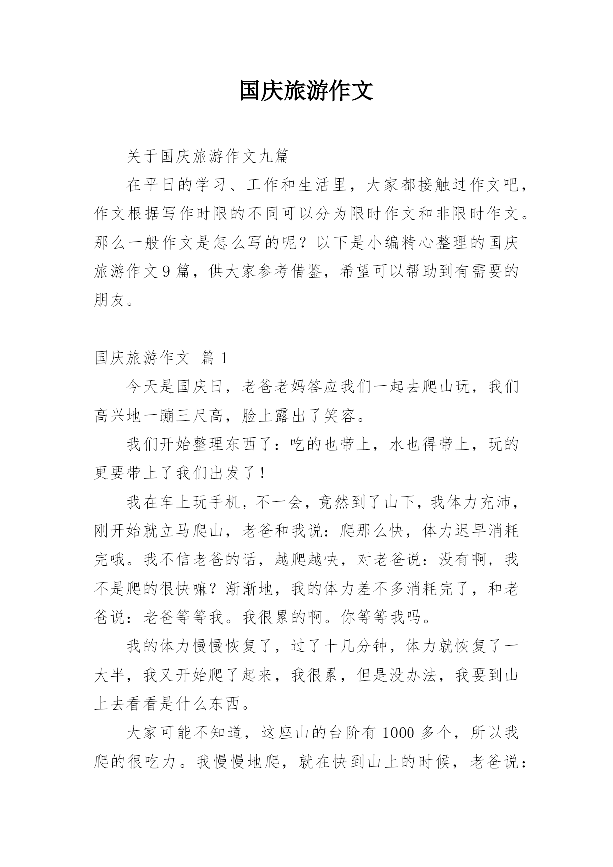 国庆旅游作文关于国庆旅游作文九篇在平日的学习、工作和生活里,大家都接触过作文吧,作文根据写作时限的不同可以分为限时作文和非限时作文。那么一般作文是怎么写的呢?以下是小编精心整理的国庆旅游作文9篇,供大家参考借鉴,希望可以帮助到有需要的朋友。国庆旅游作文篇1今天是国庆日,老爸老妈答应我们一起去爬山玩,我们高兴地一蹦三尺高,脸上露出了笑容。我们开始整理东西了:吃的也带上,水也得带上,玩的更要带上了我们出发了!我在车上玩手机,不一会,竟然到了山下,我体力充沛,刚开始就立马爬山,老爸和我说:爬那么快,体力迟早消耗