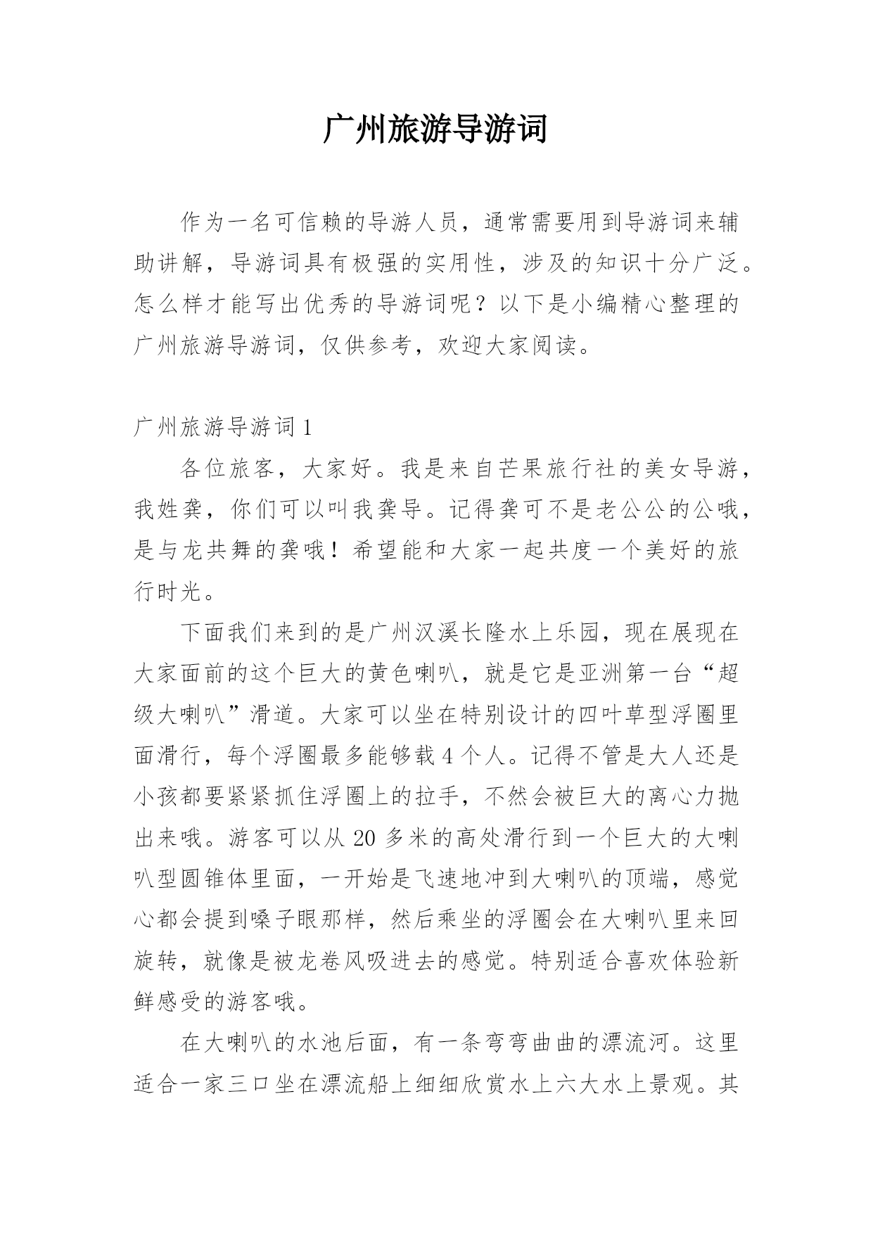 广州旅游导游词作为一名可信赖的导游人员,通常需要用到导游词来辅助讲解,导游词具有极强的实用性,涉及的知识十分广泛。怎么样才能写出优秀的导游词呢?以下是小编精心整理的广州旅游导游词,仅供参考,欢迎大家阅读。广州旅游导游词1各位旅客,大家好。我是来自芒果旅行社的美女导游,我姓龚,你们可以叫我龚导。记得龚可不是老公公的公哦,是与龙共舞的龚哦!希望能和大家一起共度一个美好的旅行时光。下面我们来到的是广州汉溪长隆水上乐园,现在展现在大家面前的这个巨大的黄色喇叭,就是它是亚洲第一台“超级大喇叭”滑道。大家可以坐在特别