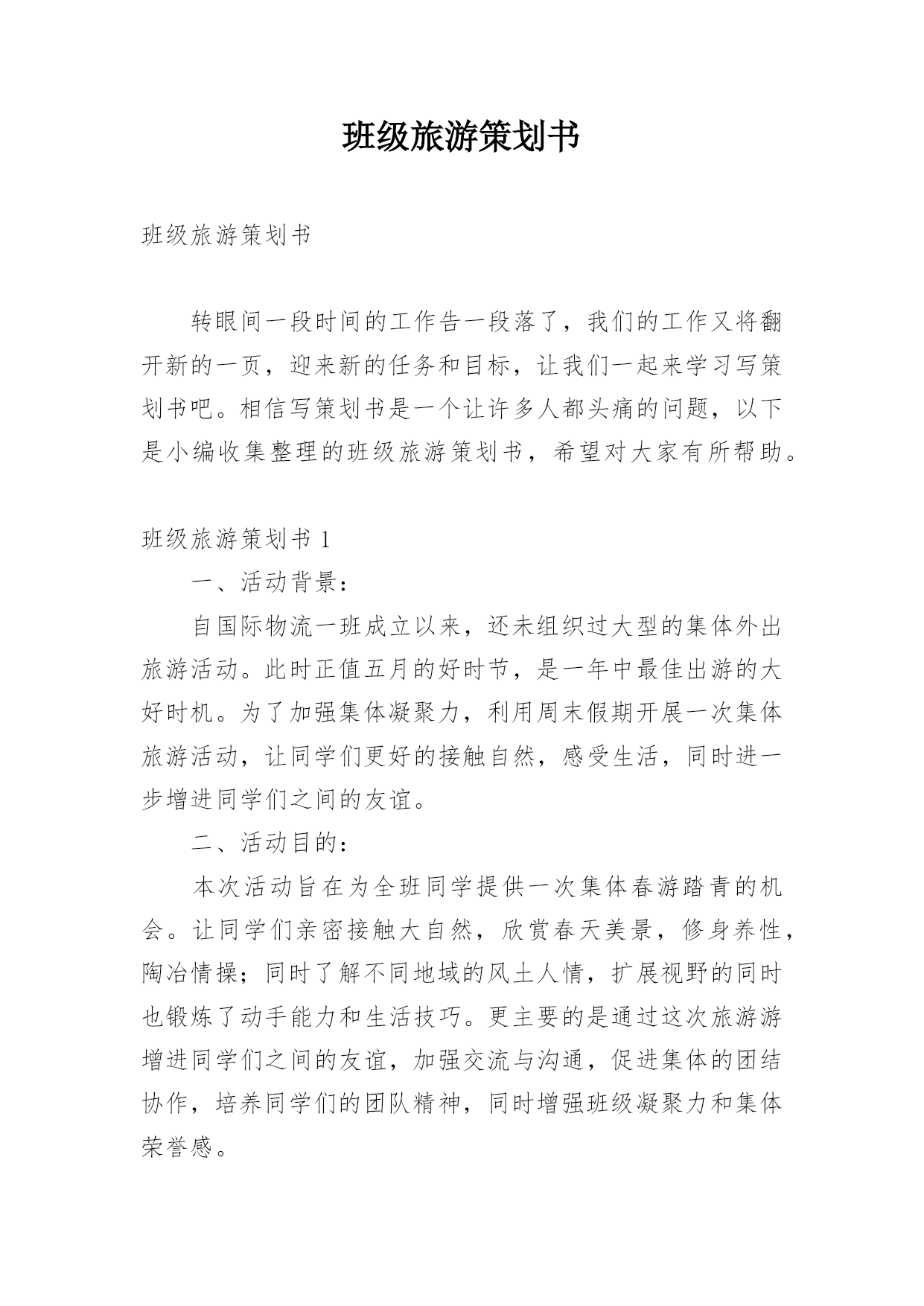 班级旅游策划书班级旅游策划书转眼间一段时间的工作告一段落了,我们的工作又将翻开新的一页,迎来新的任务和目标,让我们一起来学习写策划书吧。相信写策划书是一个让许多人都头痛的问题,以下是小编收集整理的班级旅游策划书,希望对大家有所帮助。班级旅游策划书1一、活动背景:自国际物流一班成立以来,还未组织过大型的集体外出旅游活动。此时正值五月的好时节,是一年中最佳出游的大好时机。为了加强集体凝聚力,利用周末假期开展一次集体旅游活动,让同学们更好的接触自然,感受生活,同时进一步增进同学们之间的友谊。二、活动目的:本次活