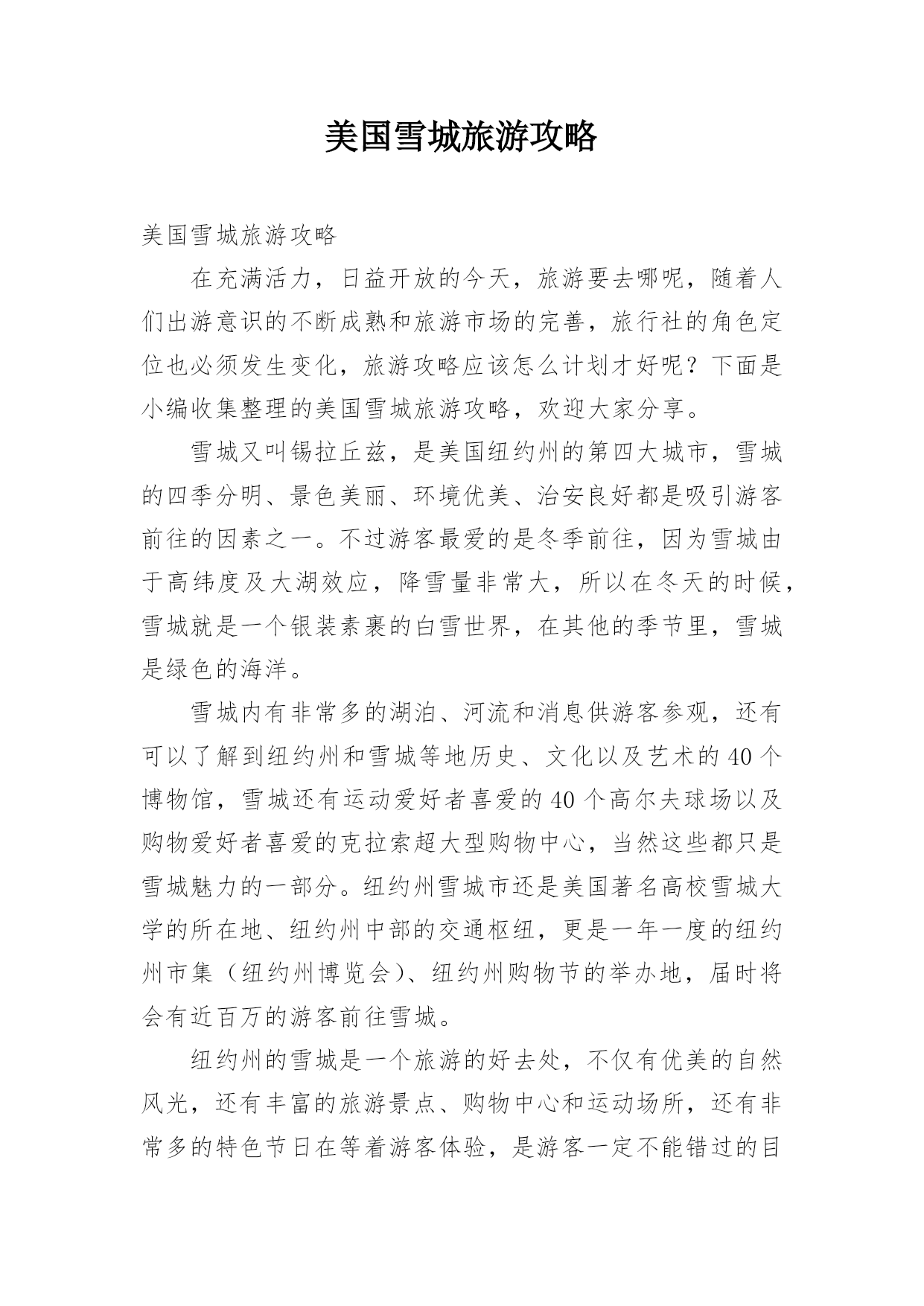 美国雪城旅游攻略美国雪城旅游攻略在充满活力,日益开放的今天,旅游要去哪呢,随着人们出游意识的不断成熟和旅游市场的完善,旅行社的角色定位也必须发生变化,旅游攻略应该怎么计划才好呢?下面是小编收集整理的美国雪城旅游攻略,欢迎大家分享。雪城又叫锡拉丘兹,是美国纽约州的第四大城市,雪城的四季分明、景色美丽、环境优美、治安良好都是吸引游客前往的因素之一。不过游客最爱的是冬季前往,因为雪城由于高纬度及大湖效应,降雪量非常大,所以在冬天的时候,雪城就是一个银装素裹的白雪世界,在其他的季节里,雪城是绿色的海洋。雪城内有非