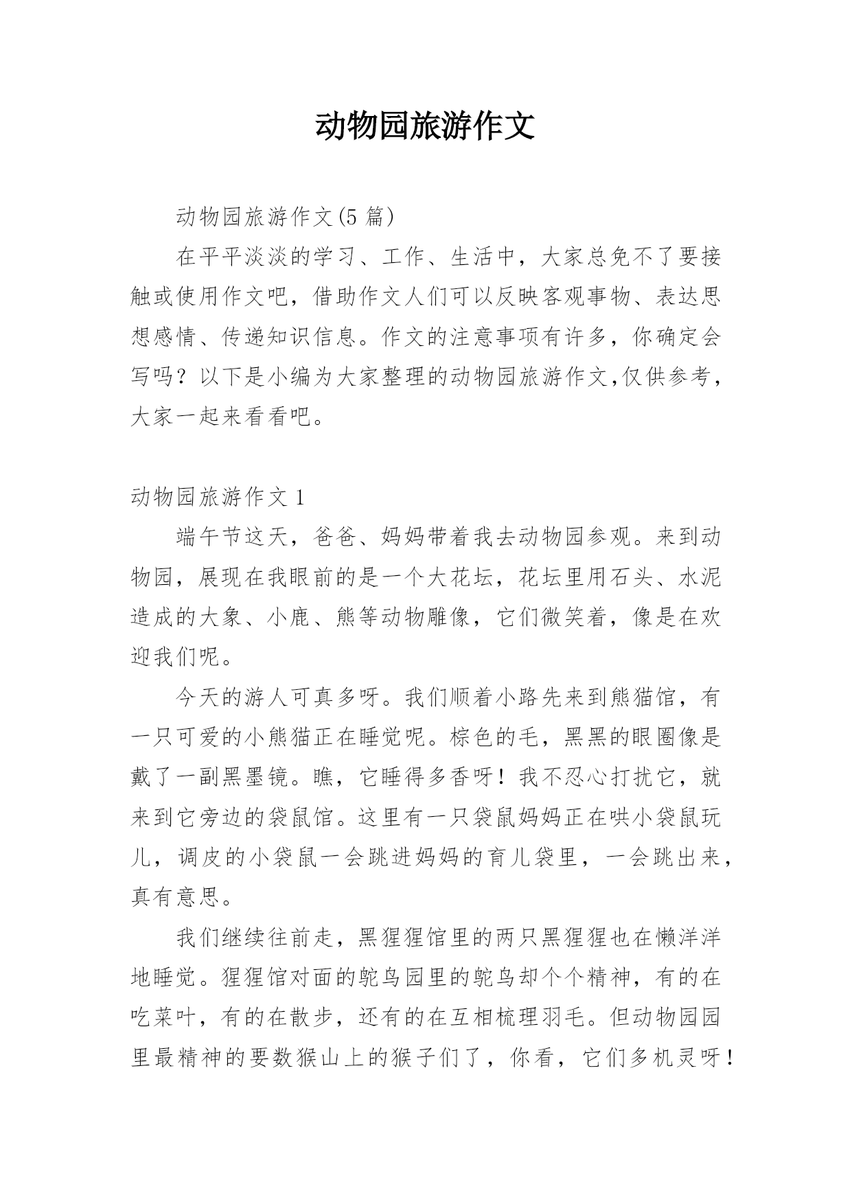 动物园旅游作文动物园旅游作文(5篇)在平平淡淡的学习、工作、生活中,大家总免不了要接触或使用作文吧,借助作文人们可以反映客观事物、表达思想感情、传递知识信息。作文的注意事项有许多,你确定会写吗?以下是小编为大家整理的动物园旅游作文,仅供参考,大家一起来看看吧。动物园旅游作文1端午节这天,爸爸、妈妈带着我去动物园参观。来到动物园,展现在我眼前的是一个大花坛,花坛里用石头、水泥造成的大象、小鹿、熊等动物雕像,它们微笑着,像是在欢迎我们呢。今天的游人可真多呀。我们顺着小路先来到熊猫馆,有一只可爱的小熊猫正在睡觉
