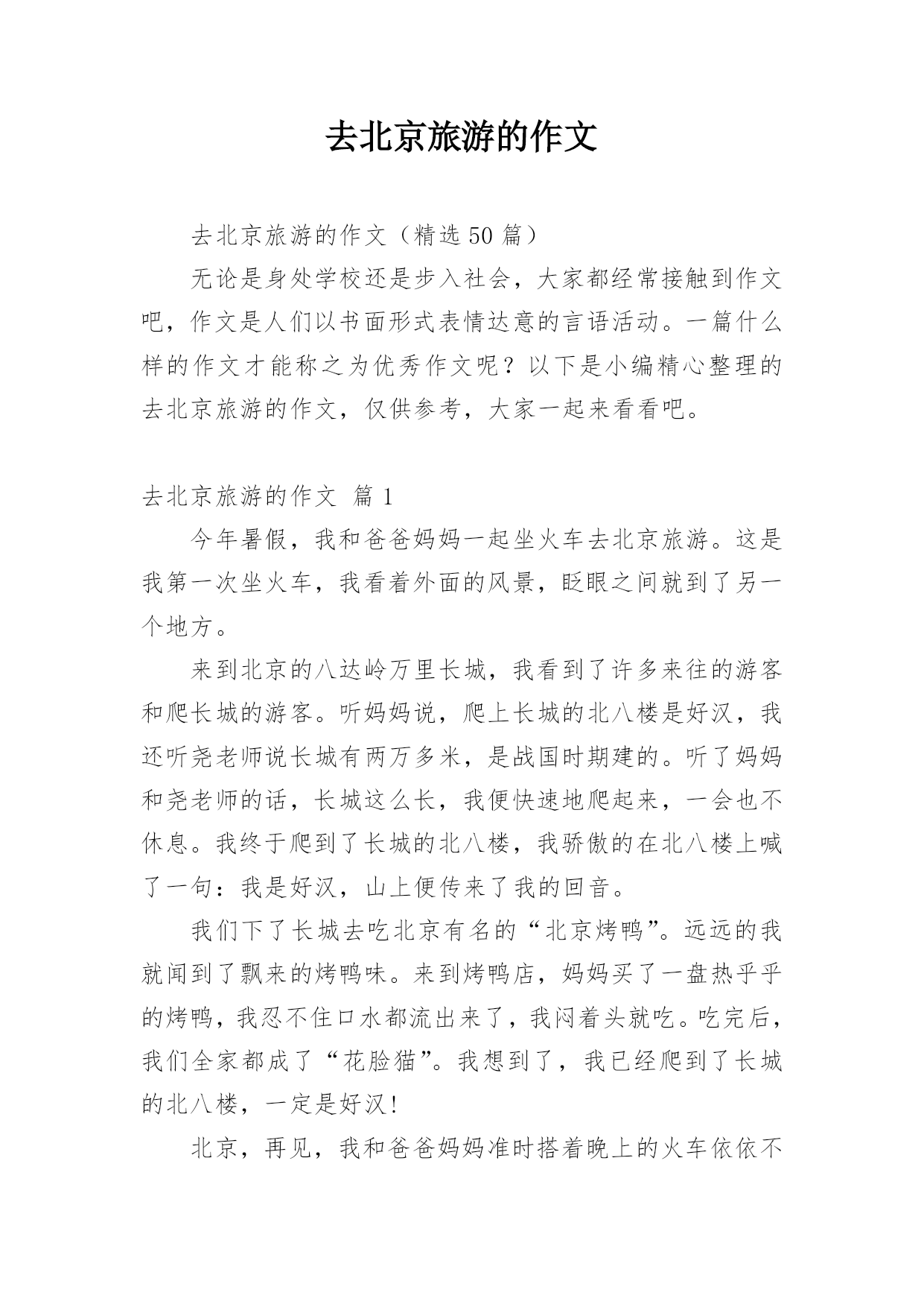 去北京旅游的作文去北京旅游的作文(精选50篇)无论是身处学校还是步入社会,大家都经常接触到作文吧,作文是人们以书面形式表情达意的言语活动。一篇什么样的作文才能称之为优秀作文呢?以下是小编精心整理的去北京旅游的作文,仅供参考,大家一起来看看吧。去北京旅游的作文篇1今年暑假,我和爸爸妈妈一起坐火车去北京旅游。这是我第一次坐火车,我看着外面的风景,眨眼之间就到了另一个地方。来到北京的八达岭万里长城,我看到了许多来往的游客和爬长城的游客。听妈妈说,爬上长城的北八楼是好汉,我还听尧老师说长城有两万多米,是战国时期建