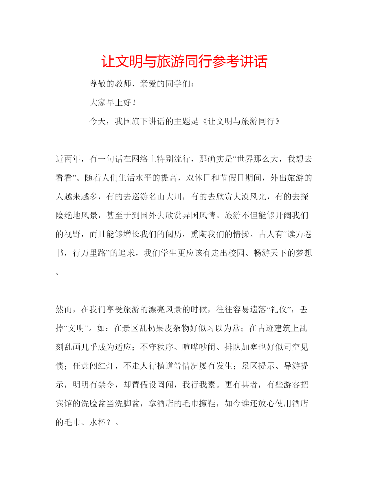 让文明与旅游同行参考讲话尊敬的教师、亲爱的同学们:大家早上好!今天,我国旗下讲话的主题是《让文明与旅游同行》近两年,有一句话在网络上特别流行,那确实是“世界那么大,我想去看看”。随着人们生活水平的提高,双休日和节假日期间,外出旅游的人越来越多,有的去巡游名山大川,有的去欣赏大漠风光,有的去探险绝地风景,甚至于到国外去欣赏异国风情。旅游不但能够开阔我们的视野,而且能够增长我们的阅历,熏陶我们的情操。古人有“读万卷书,行万里路”的追求,我们学生更应该有走出校园、畅游天下的梦想。然而,在我们享受旅游的漂亮风景的