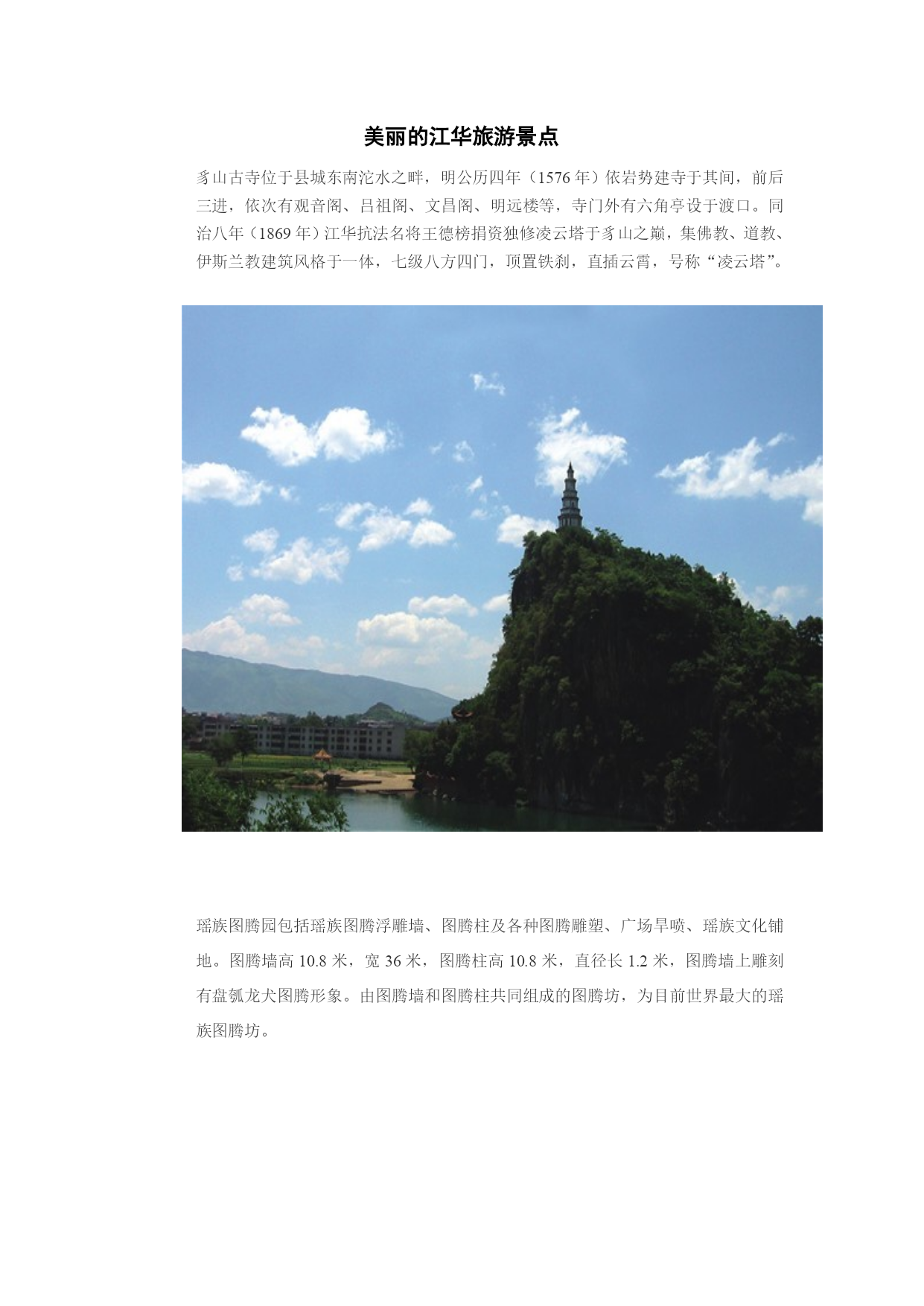 美丽的江华旅游景点豸山古寺位于县城东南沱水之畔,明公历四年(1576年)依岩势建寺于其间,前后三进,依次有观音阁、吕祖阁、文昌阁、明远楼等,寺门外有六角亭设于渡口。同治八年(1869年)江华抗法名将王德榜捐资独修凌云塔于豸山之巅,集佛教、道教、伊斯兰教建筑风格于一体,七级八方四门,顶置铁刹,直插云霄,号称“凌云塔”。瑶族图腾园包括瑶族图腾浮雕墙、图腾柱及各种图腾雕塑、广场旱喷、瑶族文化铺地。图腾墙高10.8米,宽36米,图腾柱高10.8米,直径长1.2米,图腾墙上雕刻有盘瓠龙犬图腾形象。由图腾墙和图腾柱共