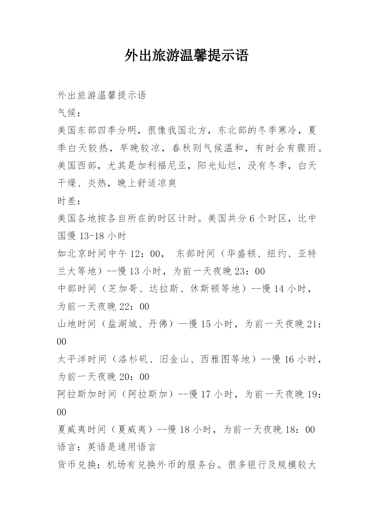 外出旅游温馨提示语外出旅游温馨提示语气候:美国东部四季分明,很像我国北方,东北部的冬季寒冷,夏季白天较热,早晚较凉,春秋则气候温和,有时会有骤雨。美国西部,尤其是加利福尼亚,阳光灿烂,没有冬季,白天干燥、炎热,晚上舒适凉爽时差:美国各地按各自所在的时区计时。美国共分6个时区,比中国慢13-18小时如北京时间中午12:00,东部时间(华盛顿、纽约、亚特兰大等地)--慢13小时,为前一天夜晚23:00中部时间(芝加哥、达拉斯、休斯顿等地)--慢14小时,为前一天夜晚22:00山地时间(盐湖城、丹佛)—慢15小