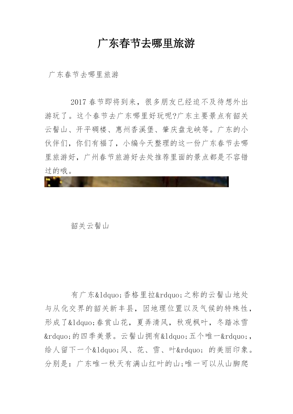 广东春节去哪里旅游广东春节去哪里旅游2017春节即将到来,很多朋友已经迫不及待想外出游玩了。这个春节去广东哪里好玩呢?广东主要景点有韶关云髻山、开平碉楼、惠州香溪堡、肇庆盘龙峡等。广东的小伙伴们,你们有福了,小编今天整理的这一份广东春节去哪里旅游好,广州春节旅游好去处推荐里面的景点都是不容错过的哦。韶关云髻山有广东“香格里拉”之称的云髻山地处与从化交界的韶关新丰县,因地理位置以及气候的特殊性,形成了“春赏山花,夏弄清风,秋观枫叶,冬踏冰雪”的四季美景。云髻山