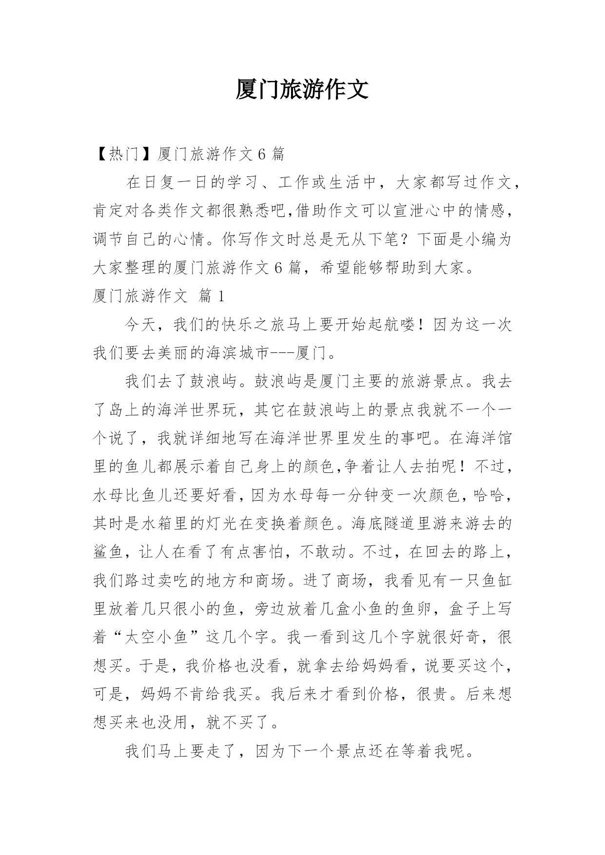 厦门旅游作文【热门】厦门旅游作文6篇在日复一日的学习、工作或生活中,大家都写过作文,肯定对各类作文都很熟悉吧,借助作文可以宣泄心中的情感,调节自己的心情。你写作文时总是无从下笔?下面是小编为大家整理的厦门旅游作文6篇,希望能够帮助到大家。厦门旅游作文篇1今天,我们的快乐之旅马上要开始起航喽!因为这一次我们要去美丽的海滨城市---厦门。我们去了鼓浪屿。鼓浪屿是厦门主要的旅游景点。我去了岛上的海洋世界玩,其它在鼓浪屿上的景点我就不一个一个说了,我就详细地写在海洋世界里发生的事吧。在海洋馆里的鱼儿都展示着自己身