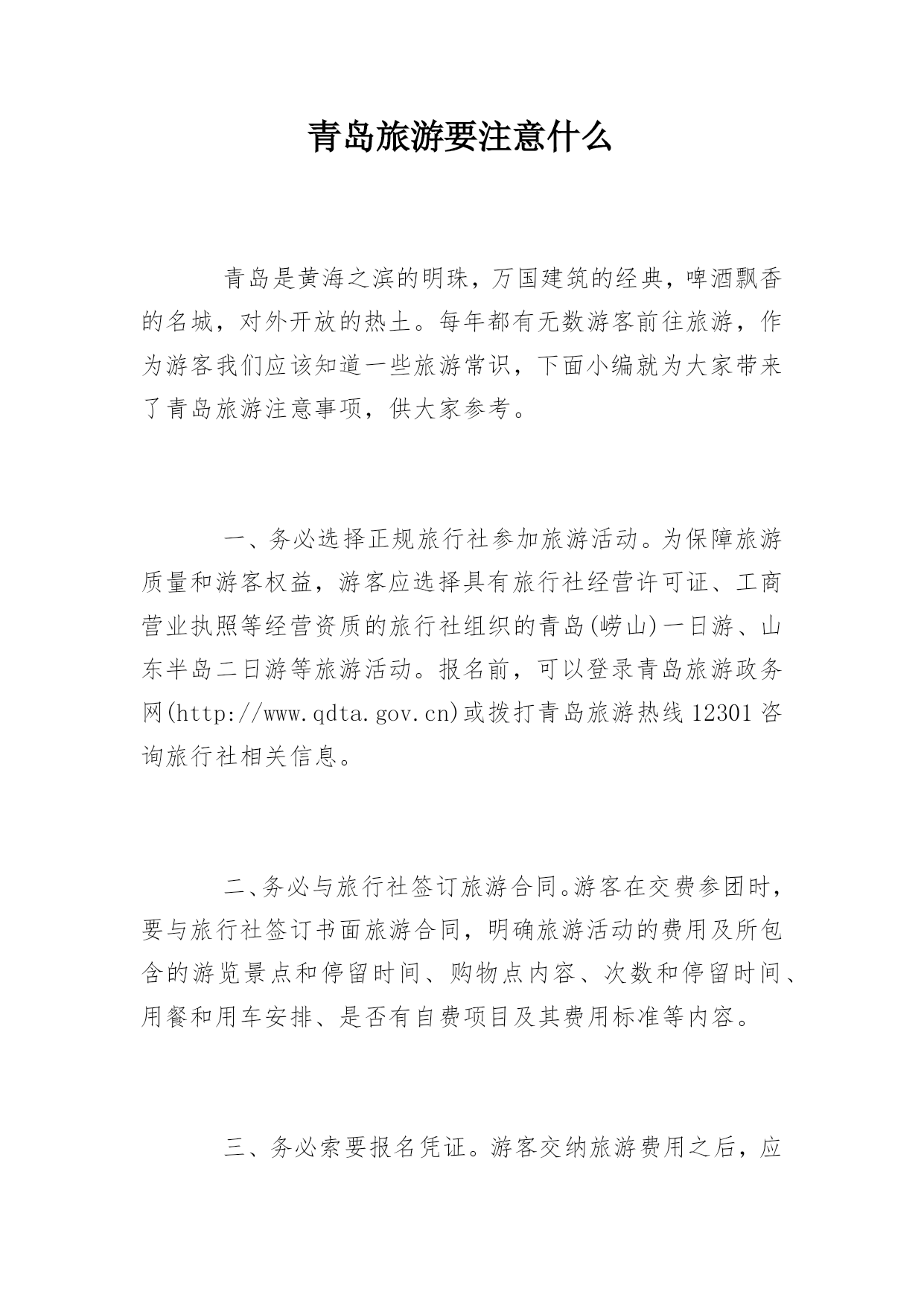 青岛旅游要注意什么青岛是黄海之滨的明珠,万国建筑的经典,啤酒飘香的名城,对外开放的热土。每年都有无数游客前往旅游,作为游客我们应该知道一些旅游常识,下面小编就为大家带来了青岛旅游注意事项,供大家参考。一、务必选择正规旅行社参加旅游活动。为保障旅游质量和游客权益,游客应选择具有旅行社经营许可证、工商营业执照等经营资质的旅行社组织的青岛(崂山)一日游、山东半岛二日游等旅游活动。报名前,可以登录青岛旅游政务网(http://www.qdta.gov.cn)或拨打青岛旅游热线12301咨询旅行社相关信息。二、务必