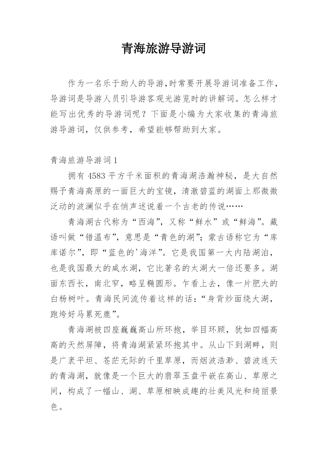 青海旅游导游词作为一名乐于助人的导游,时常要开展导游词准备工作,导游词是导游人员引导游客观光游览时的讲解词。怎么样才能写出优秀的导游词呢?下面是小编为大家收集的青海旅游导游词,仅供参考,希望能够帮助到大家。青海旅游导游词1拥有4583平方千米面积的青海湖浩瀚神秘,是大自然赐予青海高原的一面巨大的宝镜,清澈碧蓝的湖面上那微微泛动的波澜似乎在悄声述说着一个古老的传说……青海湖古代称为“西海”,又称“鲜水”或“鲜海”。藏语叫做“错温布”,意思是“青色的湖”;蒙古语称它为“库库诺尔”,即“蓝色的'海洋”。它是我国