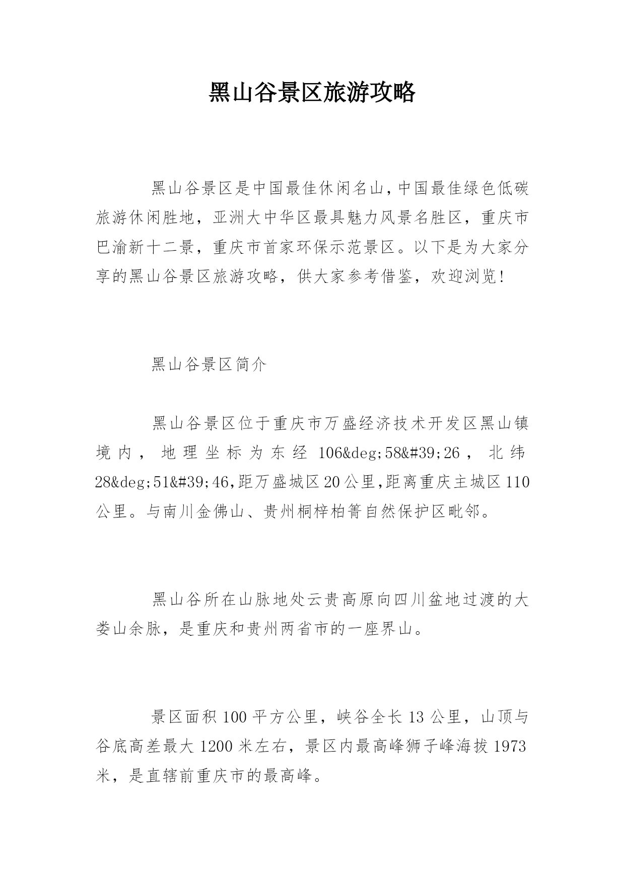 黑山谷景区旅游攻略黑山谷景区是中国最佳休闲名山,中国最佳绿色低碳旅游休闲胜地,亚洲大中华区最具魅力风景名胜区,重庆市巴渝新十二景,重庆市首家环保示范景区。以下是为大家分享的黑山谷景区旅游攻略,供大家参考借鉴,欢迎浏览!黑山谷景区简介黑山谷景区位于重庆市万盛经济技术开发区黑山镇境内,地理坐标为东经106°58'26,北纬28°51'46,距万盛城区20公里,距离重庆主城区110公里。与南川金佛山、贵州桐梓柏箐自然保护区毗邻。黑山谷所在山脉地处云贵高原向四川盆地过渡的大娄山余脉