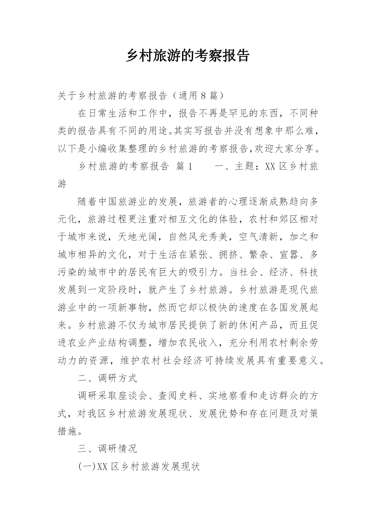 乡村旅游的考察报告关于乡村旅游的考察报告(通用8篇)在日常生活和工作中,报告不再是罕见的东西,不同种类的报告具有不同的用途。其实写报告并没有想象中那么难,以下是小编收集整理的乡村旅游的考察报告,欢迎大家分享。乡村旅游的考察报告篇1一、主题:XX区乡村旅游随着中国旅游业的发展,旅游者的心理逐渐成熟趋向多元化,旅游过程更注重对相互文化的体验,农村和郊区相对于城市来说,天地光阔,自然风光秀美,空气清新,加之和城市相异的文化,对于生活在紧张、拥挤、繁杂、宣嚣、多污染的城市中的居民有巨大的吸引力。当社会、经济、科技