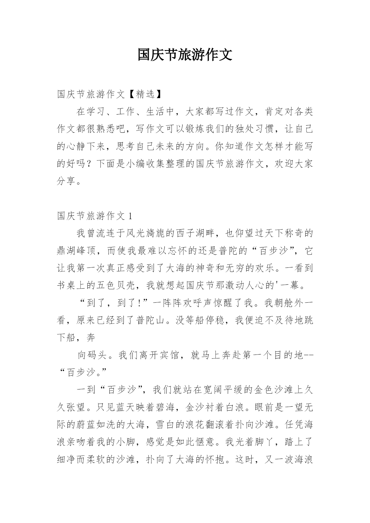 国庆节旅游作文国庆节旅游作文【精选】在学习、工作、生活中,大家都写过作文,肯定对各类作文都很熟悉吧,写作文可以锻炼我们的独处习惯,让自己的心静下来,思考自己未来的方向。你知道作文怎样才能写的好吗?下面是小编收集整理的国庆节旅游作文,欢迎大家分享。国庆节旅游作文1我曾流连于风光旖旎的西子湖畔,也仰望过天下称奇的鼎湖峰顶,而使我最难以忘怀的还是普陀的“百步沙”,它让我第一次真正感受到了大海的神奇和无穷的欢乐。一看到书桌上的五色贝壳,我就想起国庆节那激动人心的'一幕。“到了,到了!”一阵阵欢呼声惊醒了我。我朝舱