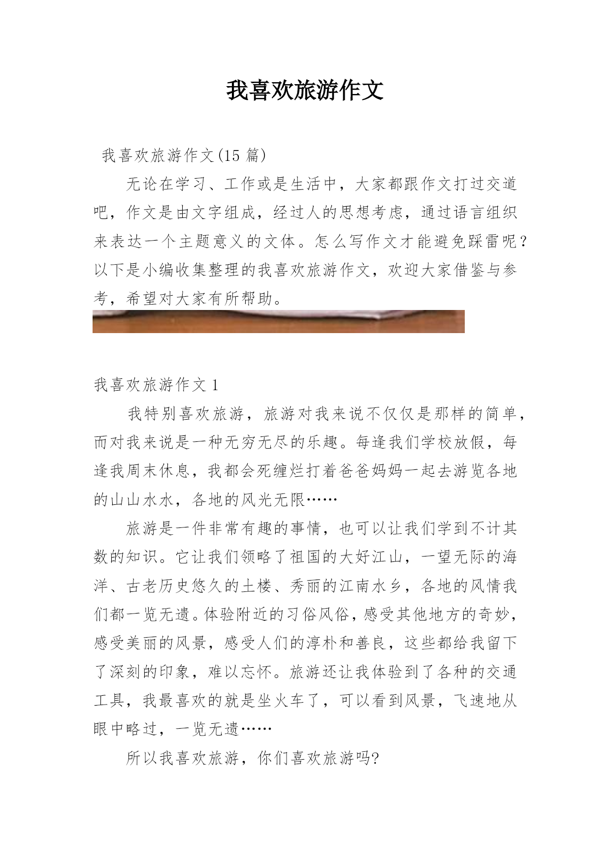 我喜欢旅游作文我喜欢旅游作文(15篇)无论在学习、工作或是生活中,大家都跟作文打过交道吧,作文是由文字组成,经过人的思想考虑,通过语言组织来表达一个主题意义的文体。怎么写作文才能避免踩雷呢?以下是小编收集整理的我喜欢旅游作文,欢迎大家借鉴与参考,希望对大家有所帮助。我喜欢旅游作文1我特别喜欢旅游,旅游对我来说不仅仅是那样的简单,而对我来说是一种无穷无尽的乐趣。每逢我们学校放假,每逢我周末休息,我都会死缠烂打着爸爸妈妈一起去游览各地的山山水水,各地的风光无限……旅游是一件非常有趣的事情,也可以让我们学到不计
