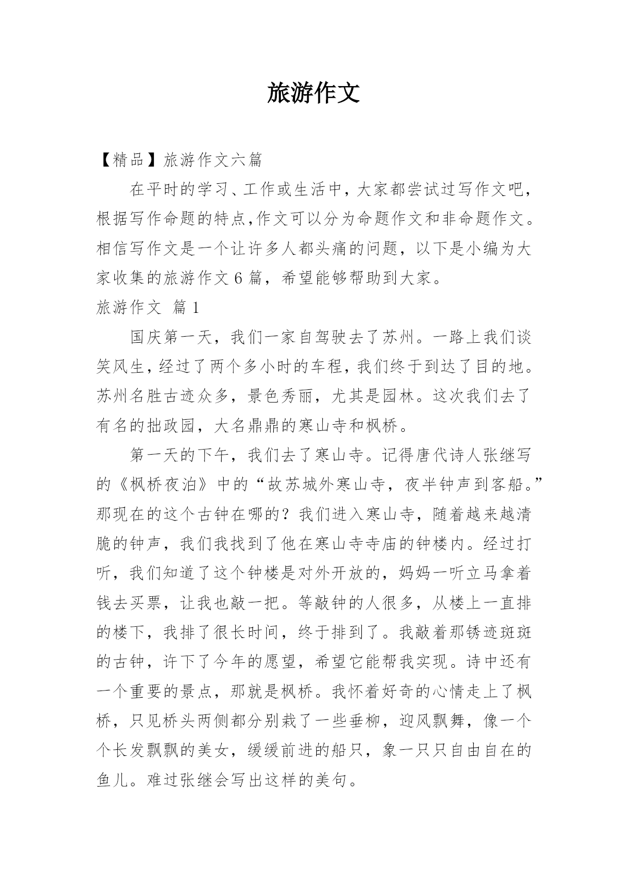 旅游作文【精品】旅游作文六篇在平时的学习、工作或生活中,大家都尝试过写作文吧,根据写作命题的特点,作文可以分为命题作文和非命题作文。相信写作文是一个让许多人都头痛的问题,以下是小编为大家收集的旅游作文6篇,希望能够帮助到大家。旅游作文篇1国庆第一天,我们一家自驾驶去了苏州。一路上我们谈笑风生,经过了两个多小时的车程,我们终于到达了目的地。苏州名胜古迹众多,景色秀丽,尤其是园林。这次我们去了有名的拙政园,大名鼎鼎的寒山寺和枫桥。第一天的下午,我们去了寒山寺。记得唐代诗人张继写的《枫桥夜泊》中的“故苏城外寒山
