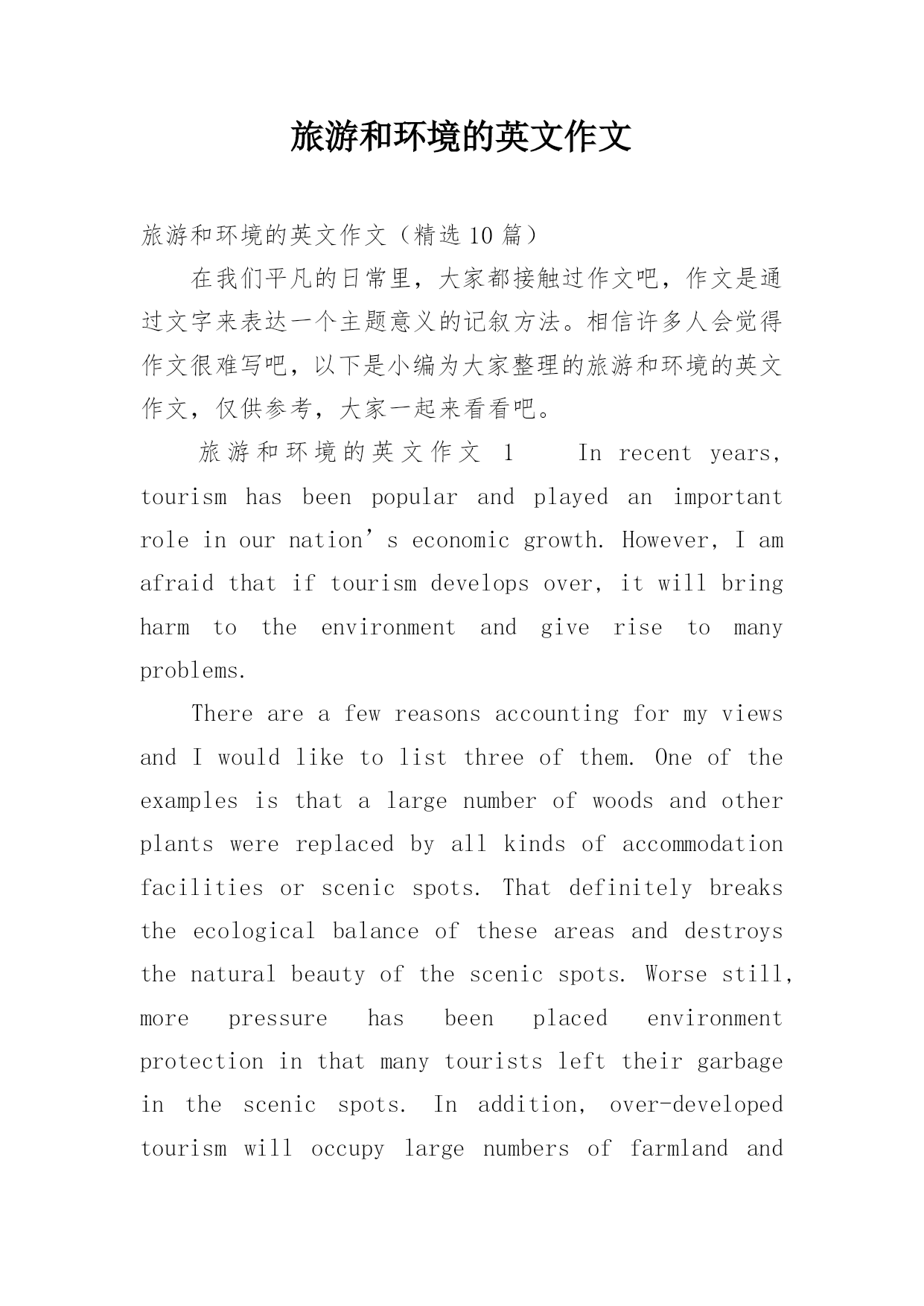 旅游和环境的英文作文旅游和环境的英文作文(精选10篇)在我们平凡的日常里,大家都接触过作文吧,作文是通过文字来表达一个主题意义的记叙方法。相信许多人会觉得作文很难写吧,以下是小编为大家整理的旅游和环境的英文作文,仅供参考,大家一起来看看吧。旅游和环境的英文作文1Inrecentyears,tourismhasbeenpopularandplayedanimportantroleinournation’seconomicgrowth.However,Iamafraidthatiftourismdevelop