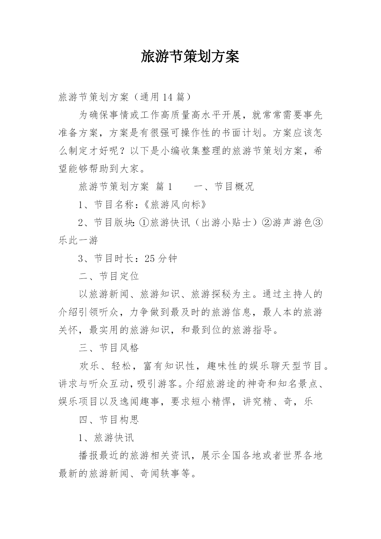 旅游节策划方案旅游节策划方案(通用14篇)为确保事情或工作高质量高水平开展,就常常需要事先准备方案,方案是有很强可操作性的书面计划。方案应该怎么制定才好呢?以下是小编收集整理的旅游节策划方案,希望能够帮助到大家。旅游节策划方案篇1一、节目概况1、节目名称:《旅游风向标》2、节目版块:①旅游快讯(出游小贴士)②游声游色③乐此一游3、节目时长:25分钟二、节目定位以旅游新闻、旅游知识、旅游探秘为主。通过主持人的介绍引领听众,力争做到最及时的旅游信息,最人本的旅游关怀,最实用的旅游知识,和最到位的旅游指导。三、