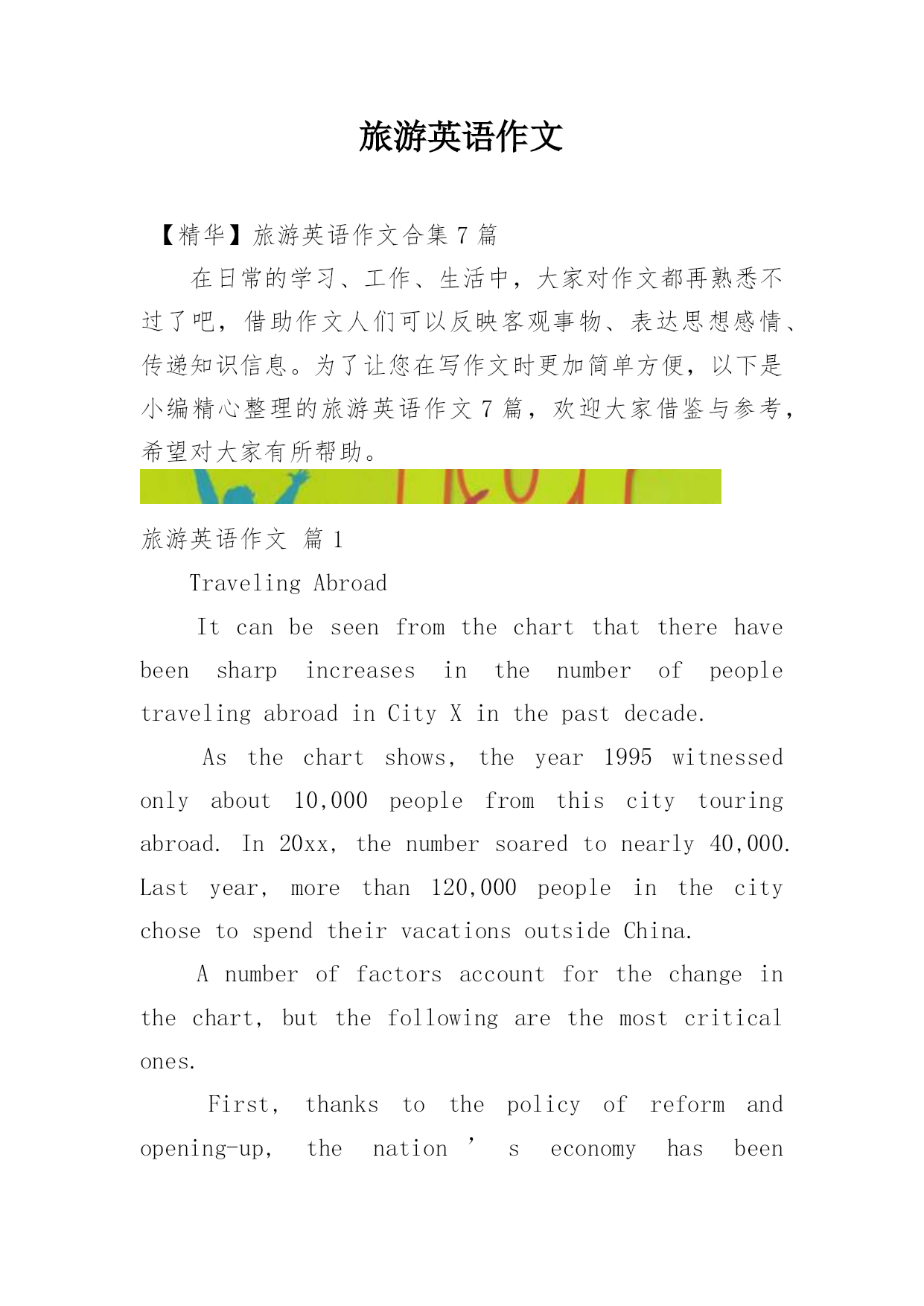 旅游英语作文【精华】旅游英语作文合集7篇在日常的学习、工作、生活中,大家对作文都再熟悉不过了吧,借助作文人们可以反映客观事物、表达思想感情、传递知识信息。为了让您在写作文时更加简单方便,以下是小编精心整理的旅游英语作文7篇,欢迎大家借鉴与参考,希望对大家有所帮助。旅游英语作文篇1TravelingAbroadItcanbeseenfromthechartthattherehavebeensharpincreasesinthenumberofpeopletravelingabroadinCityXinthe