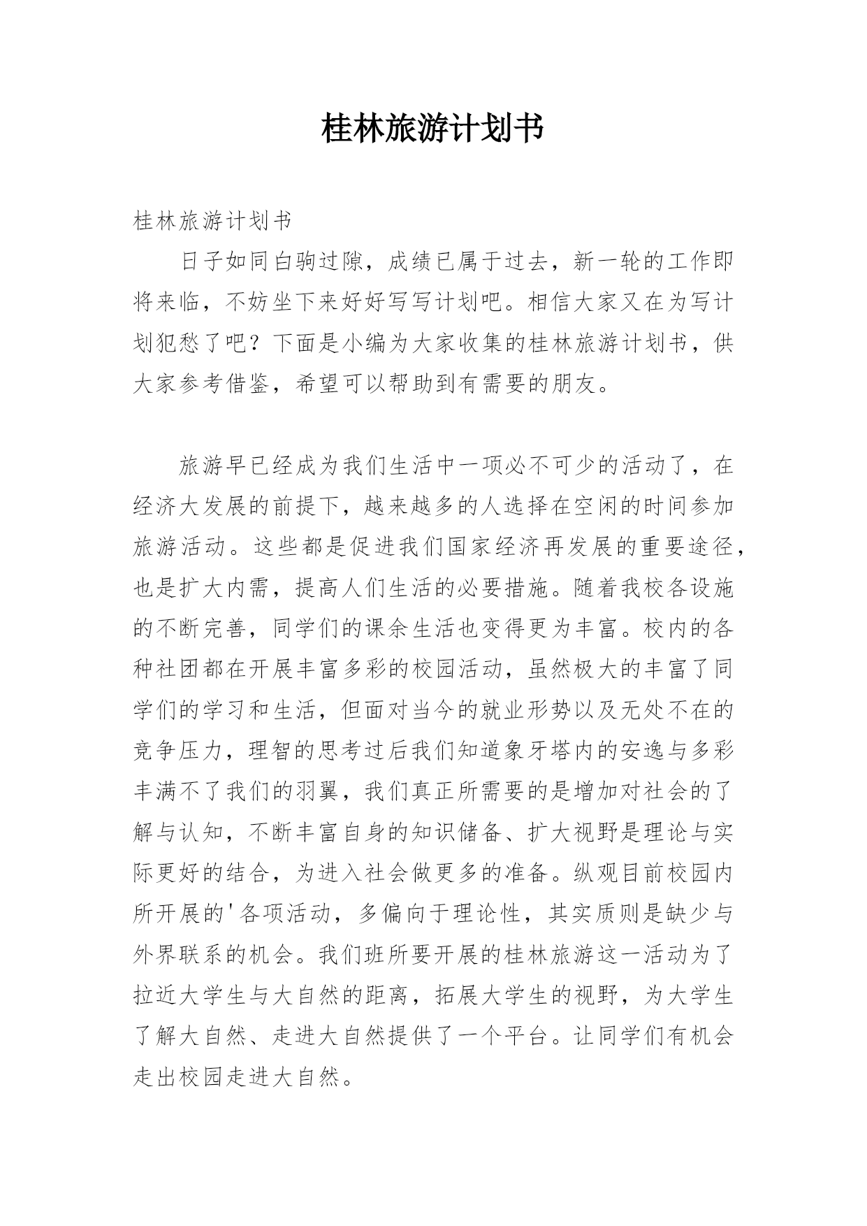 桂林旅游计划书桂林旅游计划书日子如同白驹过隙,成绩已属于过去,新一轮的工作即将来临,不妨坐下来好好写写计划吧。相信大家又在为写计划犯愁了吧?下面是小编为大家收集的桂林旅游计划书,供大家参考借鉴,希望可以帮助到有需要的朋友。旅游早已经成为我们生活中一项必不可少的活动了,在经济大发展的前提下,越来越多的人选择在空闲的时间参加旅游活动。这些都是促进我们国家经济再发展的重要途径,也是扩大内需,提高人们生活的必要措施。随着我校各设施的不断完善,同学们的课余生活也变得更为丰富。校内的各种社团都在开展丰富多彩的校园活动