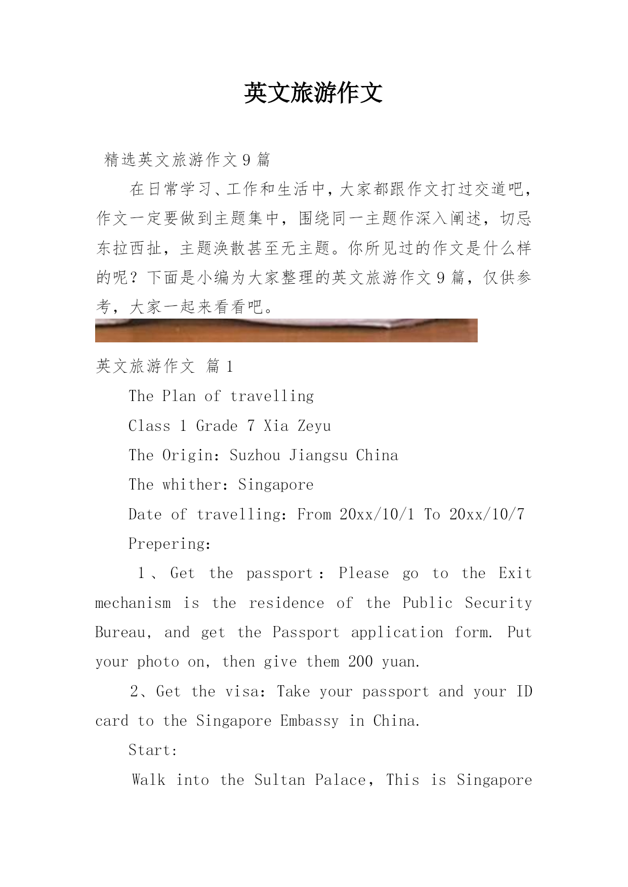 英文旅游作文精选英文旅游作文9篇在日常学习、工作和生活中,大家都跟作文打过交道吧,作文一定要做到主题集中,围绕同一主题作深入阐述,切忌东拉西扯,主题涣散甚至无主题。你所见过的作文是什么样的呢?下面是小编为大家整理的英文旅游作文9篇,仅供参考,大家一起来看看吧。英文旅游作文篇1ThePlanoftravellingClass1Grade7XiaZeyuTheOrigin:SuzhouJiangsuChinaThewhither:SingaporeDateoftravelling:From20xx/10/1T
