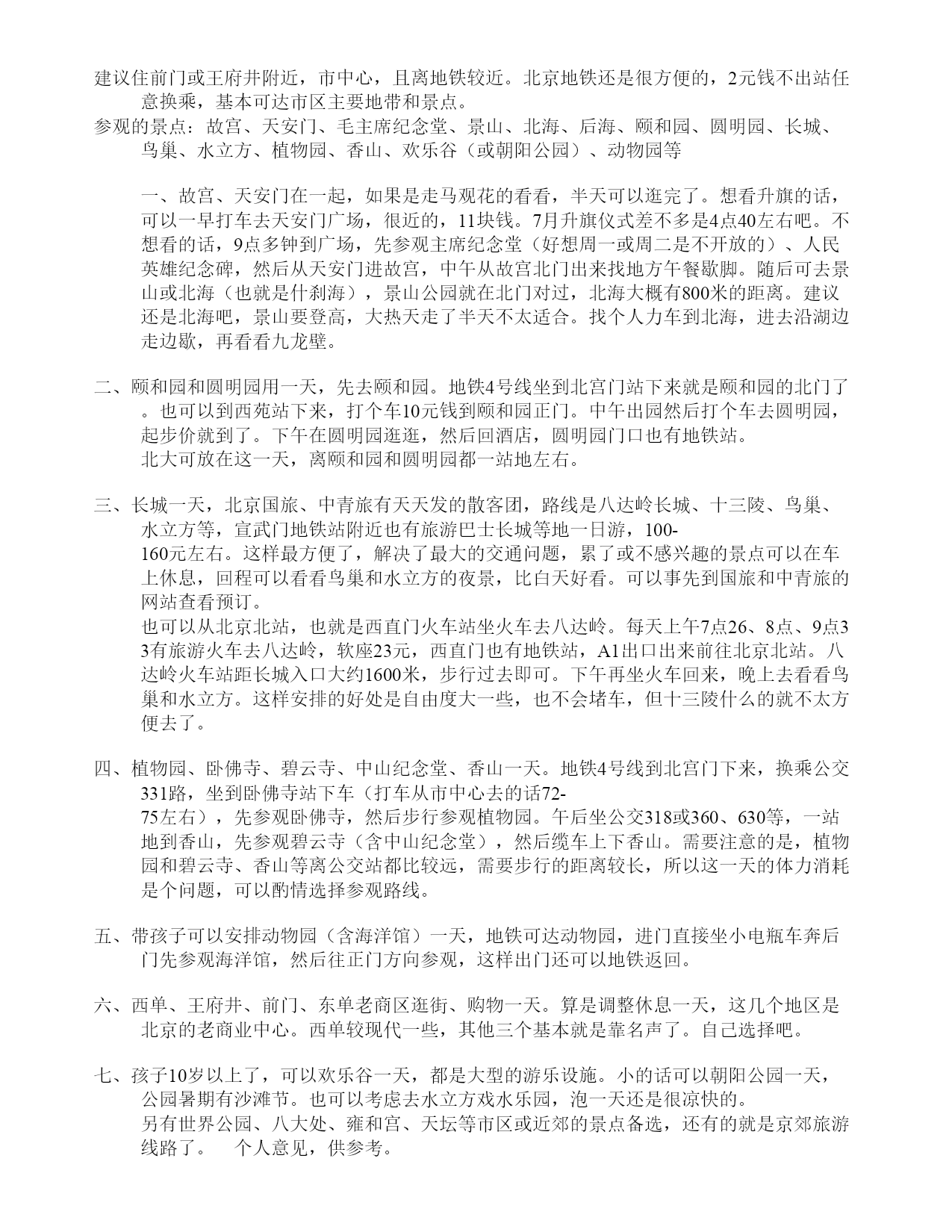 建议住前门或王府井附近,市中心,且离地铁较近。北京地铁还是很方便的,2元钱不出站任意换乘,基本可达市区主要地带和景点。参观的景点:故宫、天安门、毛主席纪念堂、景山、北海、后海、颐和园、圆明园、长城、鸟巢、水立方、植物园、香山、欢乐谷(或朝阳公园)、动物园等一、故宫、天安门在一起,如果是走马观花的看看,半天可以逛完了。想看升旗的话,可以一早打车去天安门广场,很近的,11块钱。7月升旗仪式差不多是4点40左右吧。不想看的话,9点多钟到广场,先参观主席纪念堂(好想周一或周二是不开放的)、人民英雄纪念碑,然后从天