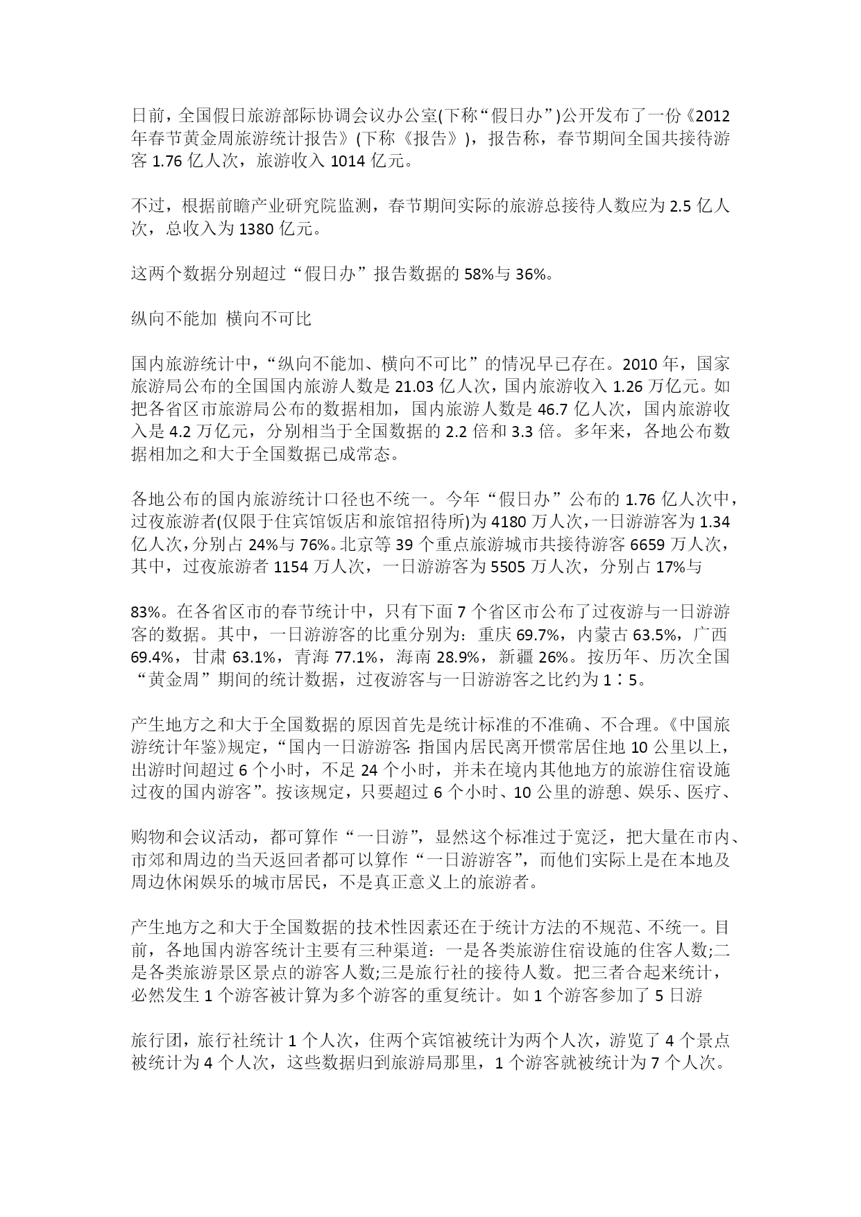 日前,全国假日旅游部际协调会议办公室(下称“假日办”)公开发布了一份《2012年春节黄金周旅游统计报告》(下称《报告》),报告称,春节期间全国共接待游客1.76亿人次,旅游收入1014亿元。不过,根据前瞻产业研究院监测,春节期间实际的旅游总接待人数应为2.5亿人次,总收入为1380亿元。这两个数据分别超过“假日办”报告数据的58%与36%。纵向不能加横向不可比国内旅游统计中,“纵向不能加、横向不可比”的情况早已存在。2010年,国家旅游局公布的全国国内旅游人数是21.03亿人次,国内旅游收入1.26万亿元