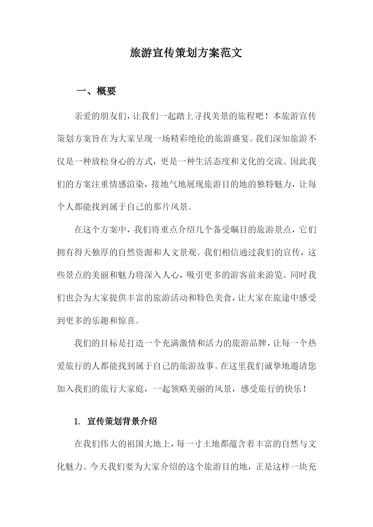 旅游宣传策划方案范文一、概要亲爱的朋友们,让我们一起踏上寻找美景的旅程吧!本旅游宣传策划方案旨在为大家呈现一场精彩绝伦的旅游盛宴。我们深知旅游不仅是一种放松身心的方式,更是一种生活态度和文化的交流。因此我们的方案注重情感渲染,接地气地展现旅游目的地的独特魅力,让每个人都能找到属于自己的那片风景。在这个方案中,我们将重点介绍几个备受瞩目的旅游景点,它们拥有得天独厚的自然资源和人文景观。我们相信通过我们的宣传,这些景点的美丽和魅力将深入人心,吸引更多的游客前来游览。同时我们也会为大家提供丰富的旅游活动和特色美