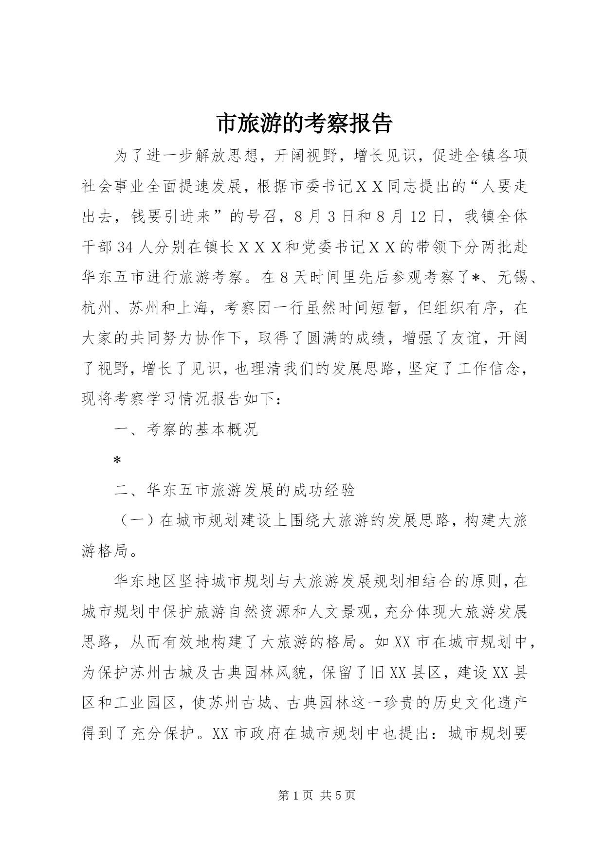 第PAGE\*Arabic\*MERGEFORMAT5页共NUMPAGES\*MERGEFORMAT5页市旅游的考察报告为了进一步解放思想,开阔视野,增长见识,促进全镇各项社会事业全面提速发展,根据市委书记XX同志提出的“人要走出去,钱要引进来”的号召,8月3日和8月12日,我镇全体干部34人分别在镇长XXX和党委书记XX的带领下分两批赴华东五市进行旅游考察。在8天时间里先后参观考察了*、无锡、杭州、苏州和上海,考察团一行虽然时间短暂,但组织有序,在大家的共同努力协作下,取得了圆满的成绩,增强