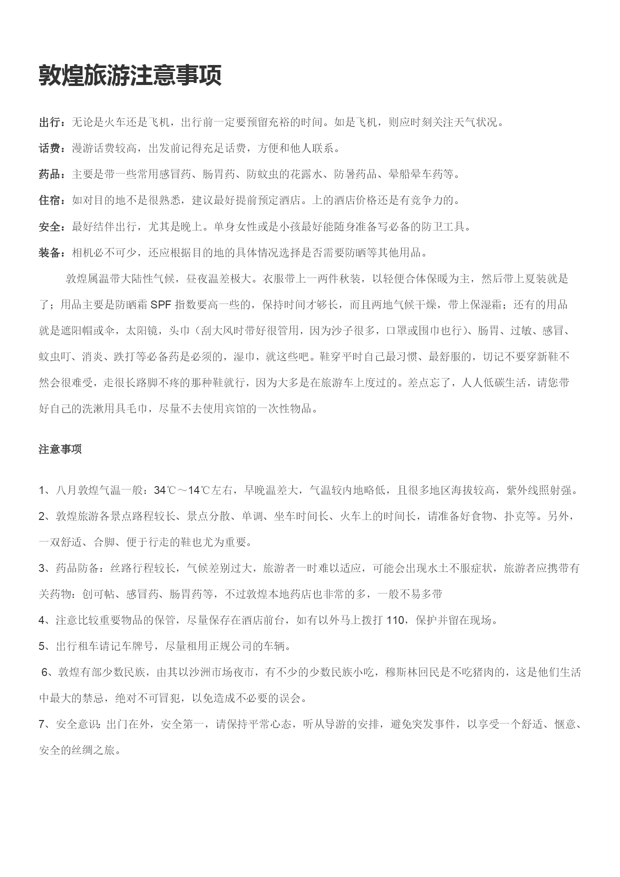 敦煌旅游注意事项出行:无论是火车还是飞机,出行前一定要预留充裕的时间。如是飞机,则应时刻关注天气状况。话费:漫游话费较高,出发前记得充足话费,方便和他人联系。药品:主要是带一些常用感冒药、肠胃药、防蚊虫的花露水、防暑药品、晕船晕车药等。住宿:如对目的地不是很熟悉,建议最好提前预定酒店。上的酒店价格还是有竞争力的。安全:最好结伴出行,尤其是晚上。单身女性或是小孩最好能随身准备写必备的防卫工具。装备:相机必不可少,还应根据目的地的具体情况选择是否需要防晒等其他用品。敦煌属温带大陆性气候,昼夜温差极大。衣服带上