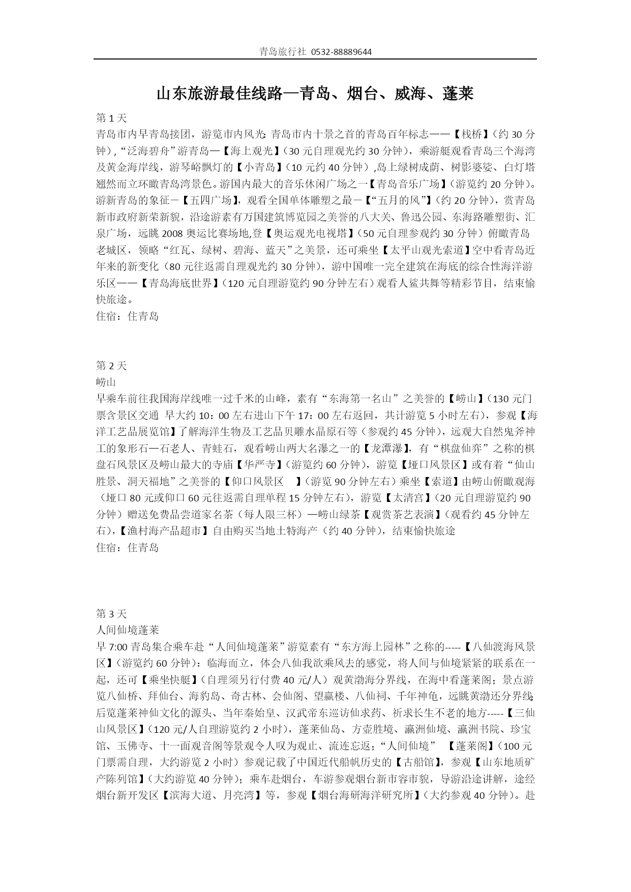 青岛旅行社0532-88889644山东旅游最佳线路—青岛、烟台、威海、蓬莱第1天青岛市内早青岛接团,游览市内风光:青岛市内十景之首的青岛百年标志——【栈桥】(约30分钟),“泛海碧舟”游青岛—【海上观光】(30元自理观光约30分钟),乘游艇观看青岛三个海湾及黄金海岸线,游琴峪飘灯的【小青岛】(10元约40分钟),岛上绿树成荫、树影婆娑、白灯塔翘然而立环瞰青岛湾景色。游国内最大的音乐休闲广场之一【青岛音乐广场】(游览约20分钟)。游新青岛的象征-【五四广场】,观看全国单体雕塑之最-【“五月的风”】(约20