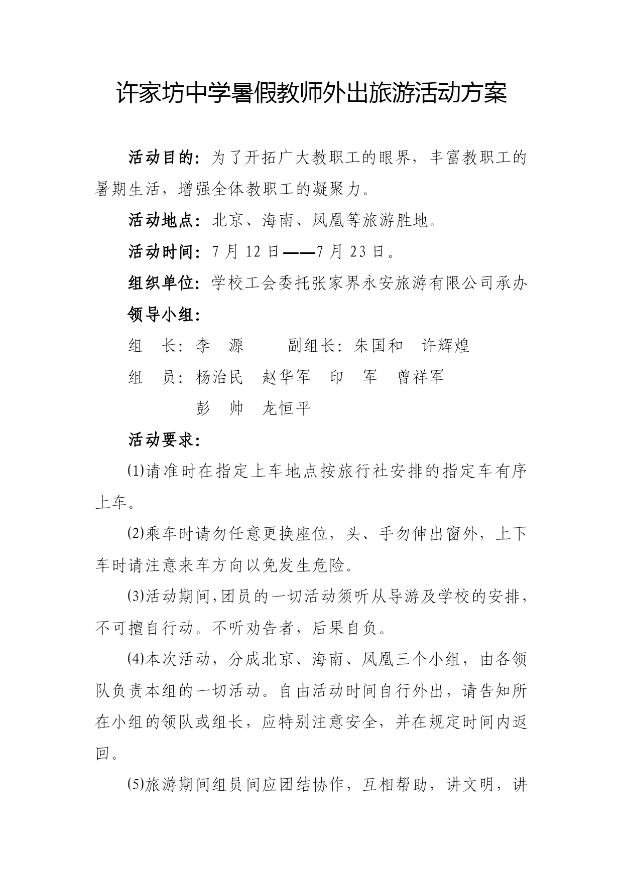 许家坊中学暑假教师外出旅游活动方案活动目的:为了开拓广大教职工的眼界,丰富教职工的暑期生活,增强全体教职工的凝聚力。活动地点:北京、海南、凤凰等旅游胜地。活动时间:7月12日――7月23日。组织单位:学校工会委托张家界永安旅游有限公司承办领导小组:组长:李源副组长:朱国和许辉煌组员:杨治民赵华军印军曾祥军彭帅龙恒平活动要求:⑴请准时在指定上车地点按旅行社安排的指定车有序上车。⑵乘车时请勿任意更换座位,头、手勿伸出窗外,上下车时请注意来车方向以免发生危险。⑶活动期间,团员的一切活动须听从导游及学校的安排,不