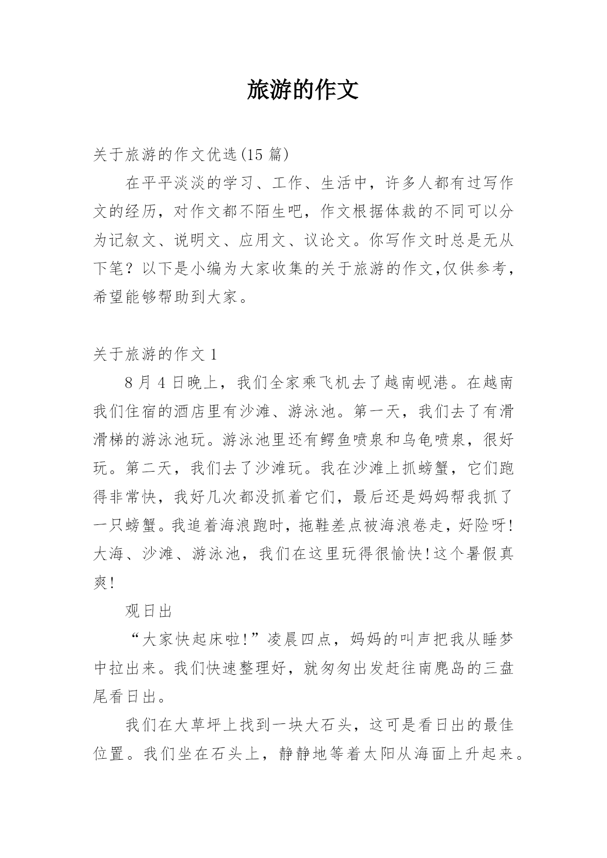 旅游的作文关于旅游的作文优选(15篇)在平平淡淡的学习、工作、生活中,许多人都有过写作文的经历,对作文都不陌生吧,作文根据体裁的不同可以分为记叙文、说明文、应用文、议论文。你写作文时总是无从下笔?以下是小编为大家收集的关于旅游的作文,仅供参考,希望能够帮助到大家。关于旅游的作文18月4日晚上,我们全家乘飞机去了越南岘港。在越南我们住宿的酒店里有沙滩、游泳池。第一天,我们去了有滑滑梯的游泳池玩。游泳池里还有鳄鱼喷泉和乌龟喷泉,很好玩。第二天,我们去了沙滩玩。我在沙滩上抓螃蟹,它们跑得非常快,我好几次都没抓着
