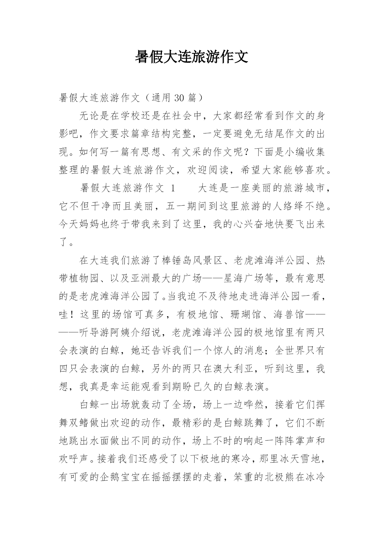 暑假大连旅游作文暑假大连旅游作文(通用30篇)无论是在学校还是在社会中,大家都经常看到作文的身影吧,作文要求篇章结构完整,一定要避免无结尾作文的出现。如何写一篇有思想、有文采的作文呢?下面是小编收集整理的暑假大连旅游作文,欢迎阅读,希望大家能够喜欢。暑假大连旅游作文1大连是一座美丽的旅游城市,它不但干净而且美丽,五一期间到这里旅游的人络绎不绝。今天妈妈也终于带我来到了这里,我的心兴奋地快要飞出来了。在大连我们旅游了棒锤岛风景区、老虎滩海洋公园、热带植物园、以及亚洲最大的广场——星海广场等,最有意思的是老虎