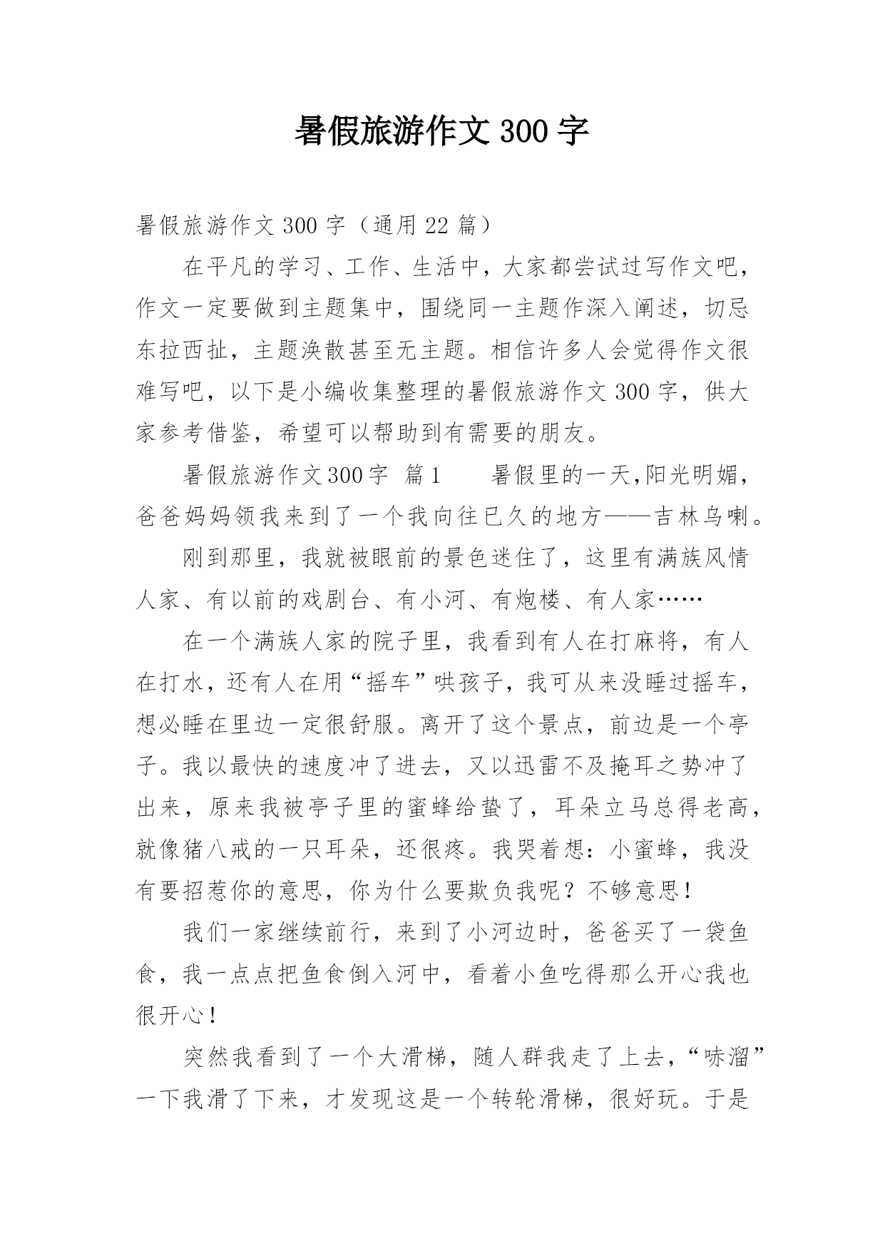 暑假旅游作文300字暑假旅游作文300字(通用22篇)在平凡的学习、工作、生活中,大家都尝试过写作文吧,作文一定要做到主题集中,围绕同一主题作深入阐述,切忌东拉西扯,主题涣散甚至无主题。相信许多人会觉得作文很难写吧,以下是小编收集整理的暑假旅游作文300字,供大家参考借鉴,希望可以帮助到有需要的朋友。暑假旅游作文300字篇1暑假里的一天,阳光明媚,爸爸妈妈领我来到了一个我向往已久的地方——吉林乌喇。刚到那里,我就被眼前的景色迷住了,这里有满族风情人家、有以前的戏剧台、有小河、有炮楼、有人家……在一个满族人