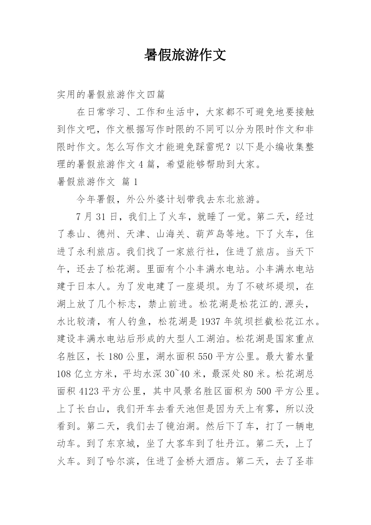 暑假旅游作文实用的暑假旅游作文四篇在日常学习、工作和生活中,大家都不可避免地要接触到作文吧,作文根据写作时限的不同可以分为限时作文和非限时作文。怎么写作文才能避免踩雷呢?以下是小编收集整理的暑假旅游作文4篇,希望能够帮助到大家。暑假旅游作文篇1今年署假,外公外婆计划带我去东北旅游。7月31日,我们上了火车,就睡了一觉。第二天,经过了泰山、德州、天津、山海关、葫芦岛等地。下了火车,住进了永利旅店。我们找了一家旅行社,住进了旅店。当天下午,还去了松花湖。里面有个小丰满水电站。小丰满水电站建于日本人。为了发电建