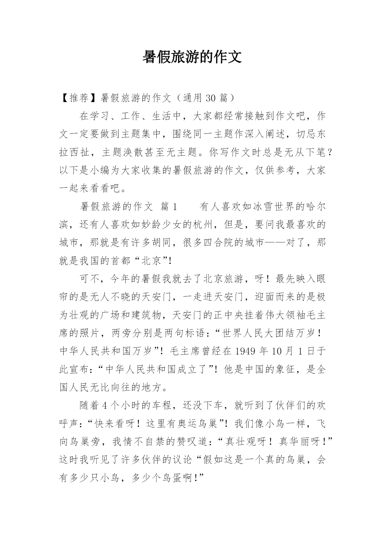 暑假旅游的作文【推荐】暑假旅游的作文(通用30篇)在学习、工作、生活中,大家都经常接触到作文吧,作文一定要做到主题集中,围绕同一主题作深入阐述,切忌东拉西扯,主题涣散甚至无主题。你写作文时总是无从下笔?以下是小编为大家收集的暑假旅游的作文,仅供参考,大家一起来看看吧。暑假旅游的作文篇1有人喜欢如冰雪世界的哈尔滨,还有人喜欢如妙龄少女的杭州,但是,要问我最喜欢的城市,那就是有许多胡同,很多四合院的城市——对了,那就是我国的首都“北京”!可不,今年的暑假我就去了北京旅游,呀!最先映入眼帘的是无人不晓的天安门,
