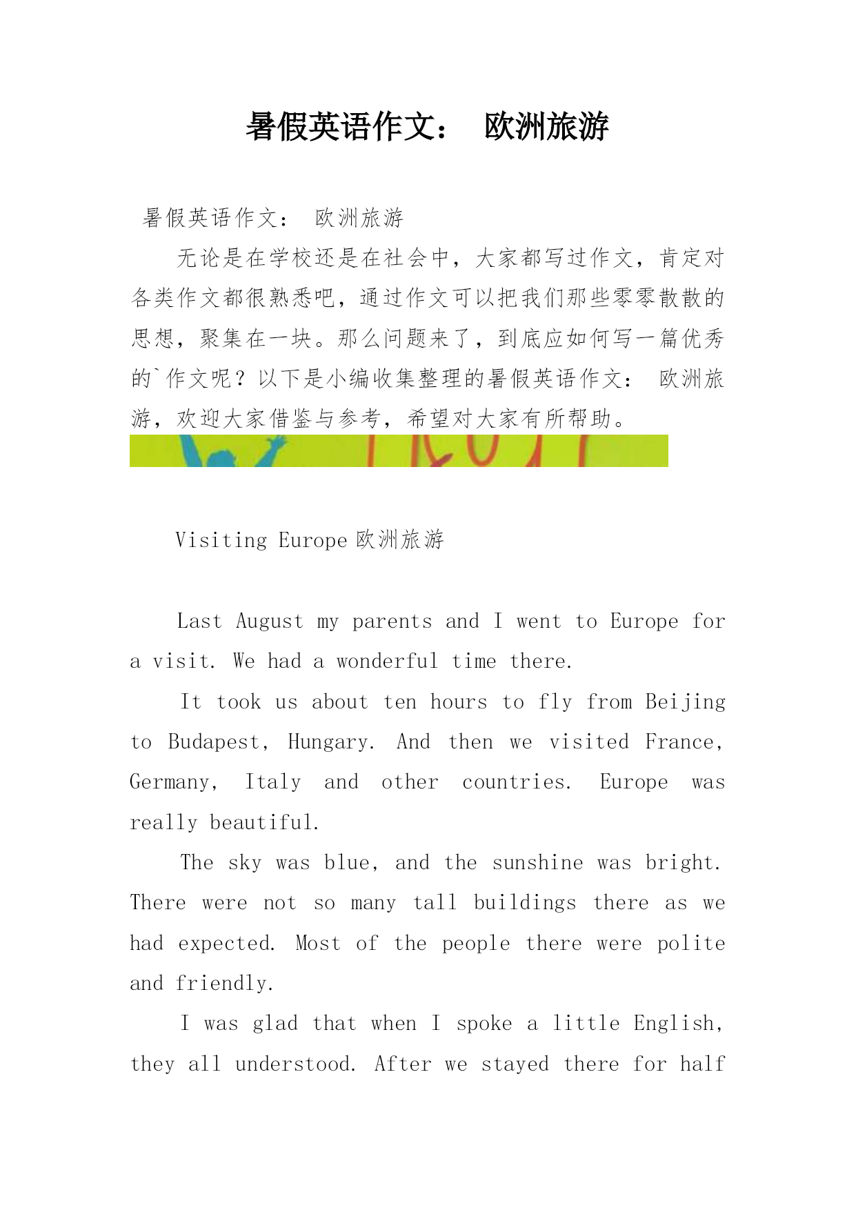 暑假英语作文:欧洲旅游暑假英语作文:欧洲旅游无论是在学校还是在社会中,大家都写过作文,肯定对各类作文都很熟悉吧,通过作文可以把我们那些零零散散的思想,聚集在一块。那么问题来了,到底应如何写一篇优秀的`作文呢?以下是小编收集整理的暑假英语作文:欧洲旅游,欢迎大家借鉴与参考,希望对大家有所帮助。VisitingEurope欧洲旅游LastAugustmyparentsandIwenttoEuropeforavisit.Wehadawonderfultimethere.Ittookusabouttenhours