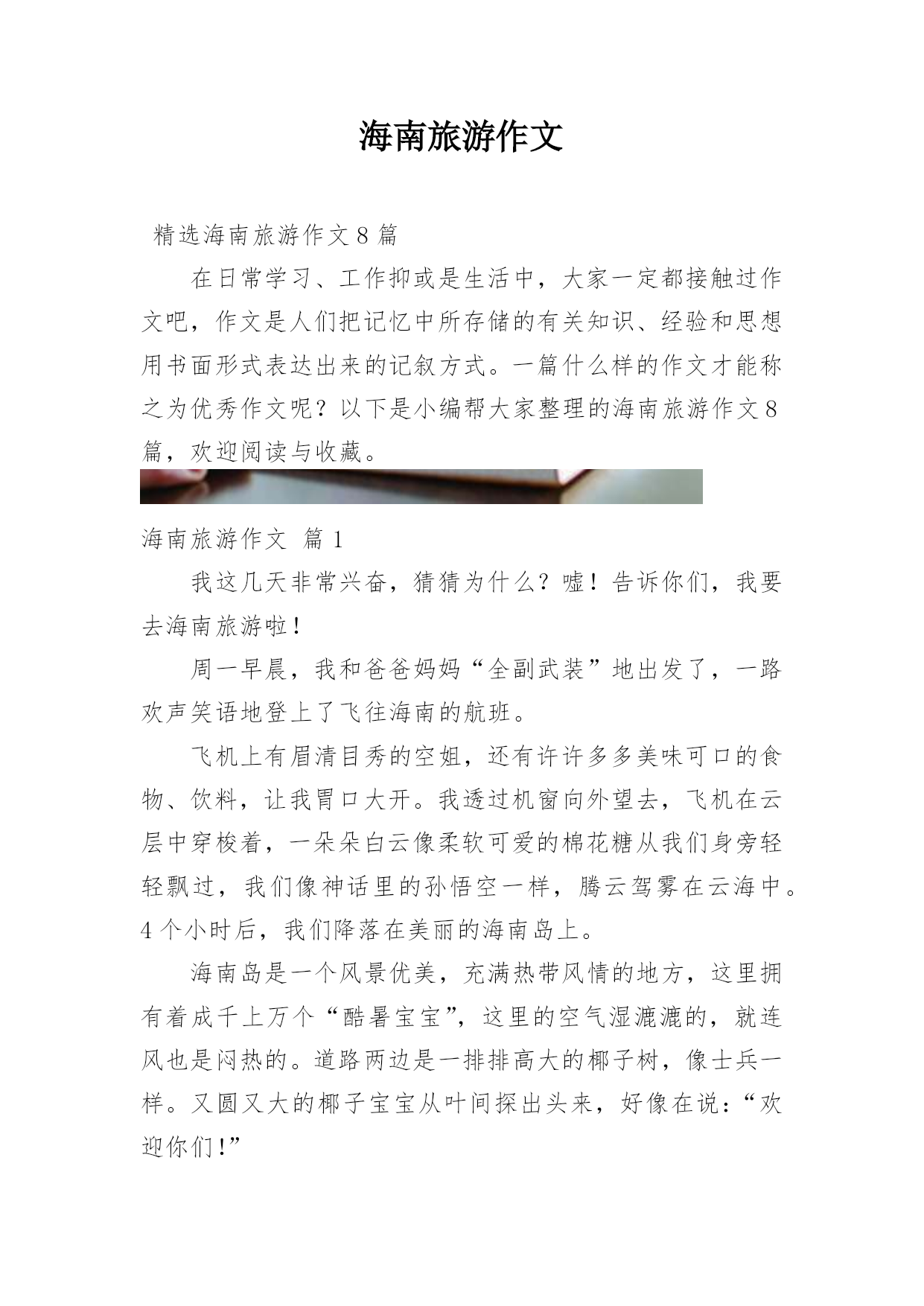 海南旅游作文精选海南旅游作文8篇在日常学习、工作抑或是生活中,大家一定都接触过作文吧,作文是人们把记忆中所存储的有关知识、经验和思想用书面形式表达出来的记叙方式。一篇什么样的作文才能称之为优秀作文呢?以下是小编帮大家整理的海南旅游作文8篇,欢迎阅读与收藏。海南旅游作文篇1我这几天非常兴奋,猜猜为什么?嘘!告诉你们,我要去海南旅游啦!周一早晨,我和爸爸妈妈“全副武装”地出发了,一路欢声笑语地登上了飞往海南的航班。飞机上有眉清目秀的空姐,还有许许多多美味可口的食物、饮料,让我胃口大开。我透过机窗向外望去,飞机